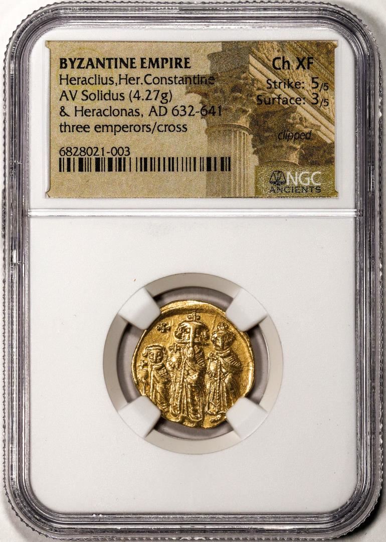 One Byzantine Empire 632-641 AD Heraclius, Her. Constantine & Heraclonas Solidus NGC Ch XF. NGC Certified.