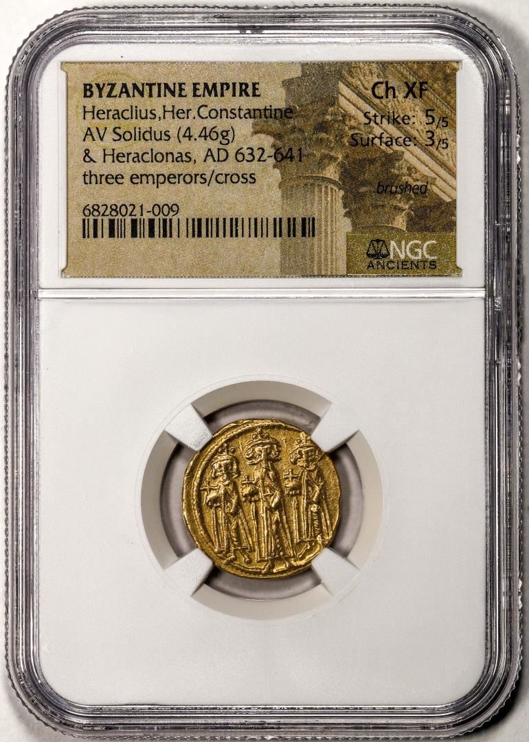 One Byzantine Empire 632-641 AD Heraclius, Her. Constantine & Heraclonas Solidus NGC Ch XF. NGC Certified.