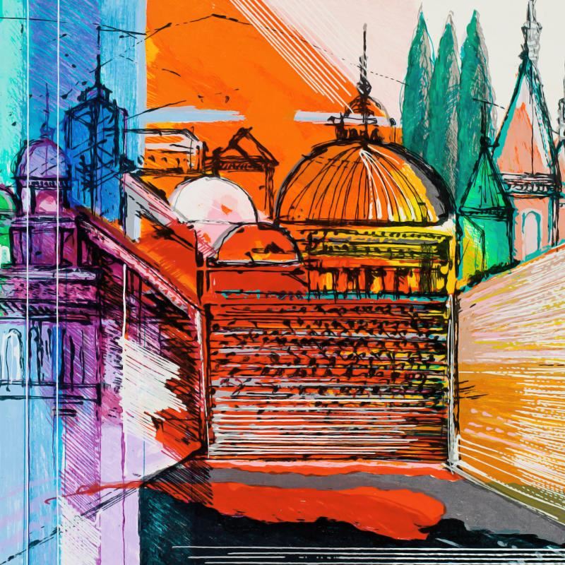 "Jerusalem Spirit" is a limited edition serigraph on paper by Calman Shemi, numbered and hand signed by the artist. Includes Letter of Authenticity. Measures approx. 17.5" x 17.5" (image).