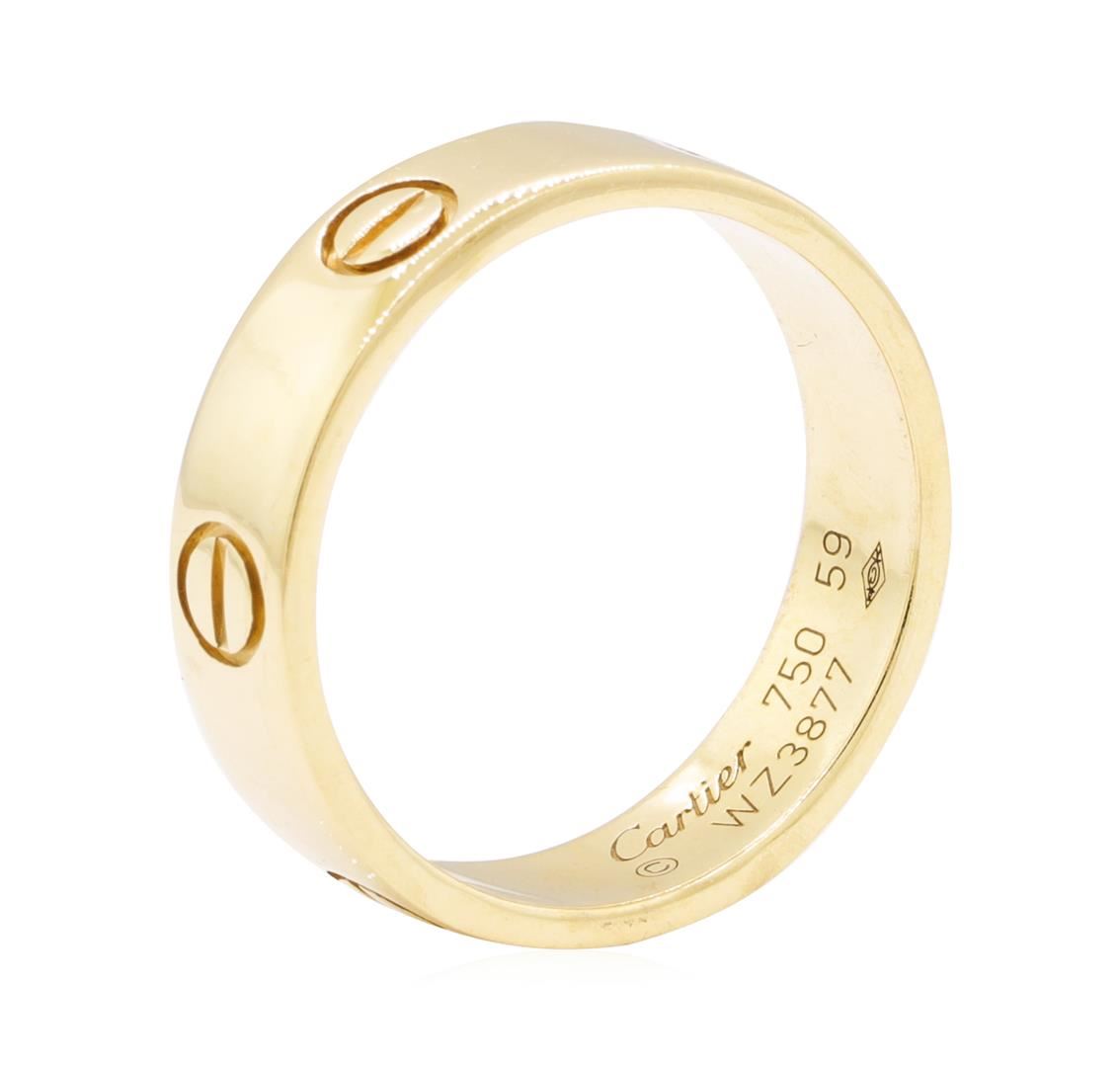 One Cartier love ring featuring: 18KT yellow gold weighing 8.5 grams. The ring is engraved with serial number WZ3877. The ring is American size 8, European size 59.