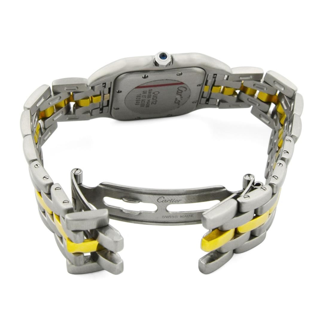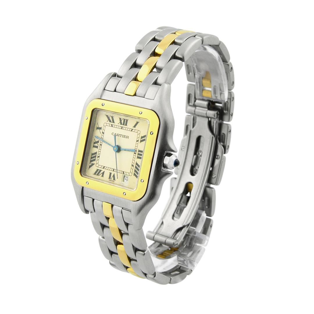 Cartier Lady Panthere 18KT Yellow Gold & Stainless Steel 27mm Silver Roman Dial Watch Polished & Electronically Tested. Model: Panthere. Case: 18KT Yellow Gold & Stainless Steel. Crystal: Sapphire Crystal. Bracelet: 18KT Yellow Gold & Stainless Steel. Dial: Silver Roman Dial. Date Window: 5 O'clock Position. Movement: Quartz Movement. Water Resistant: Yes. Case Size: 27mm. Condition: Pre Owned, Watch is free of all Scratches and Dents, Near Mint G-7.