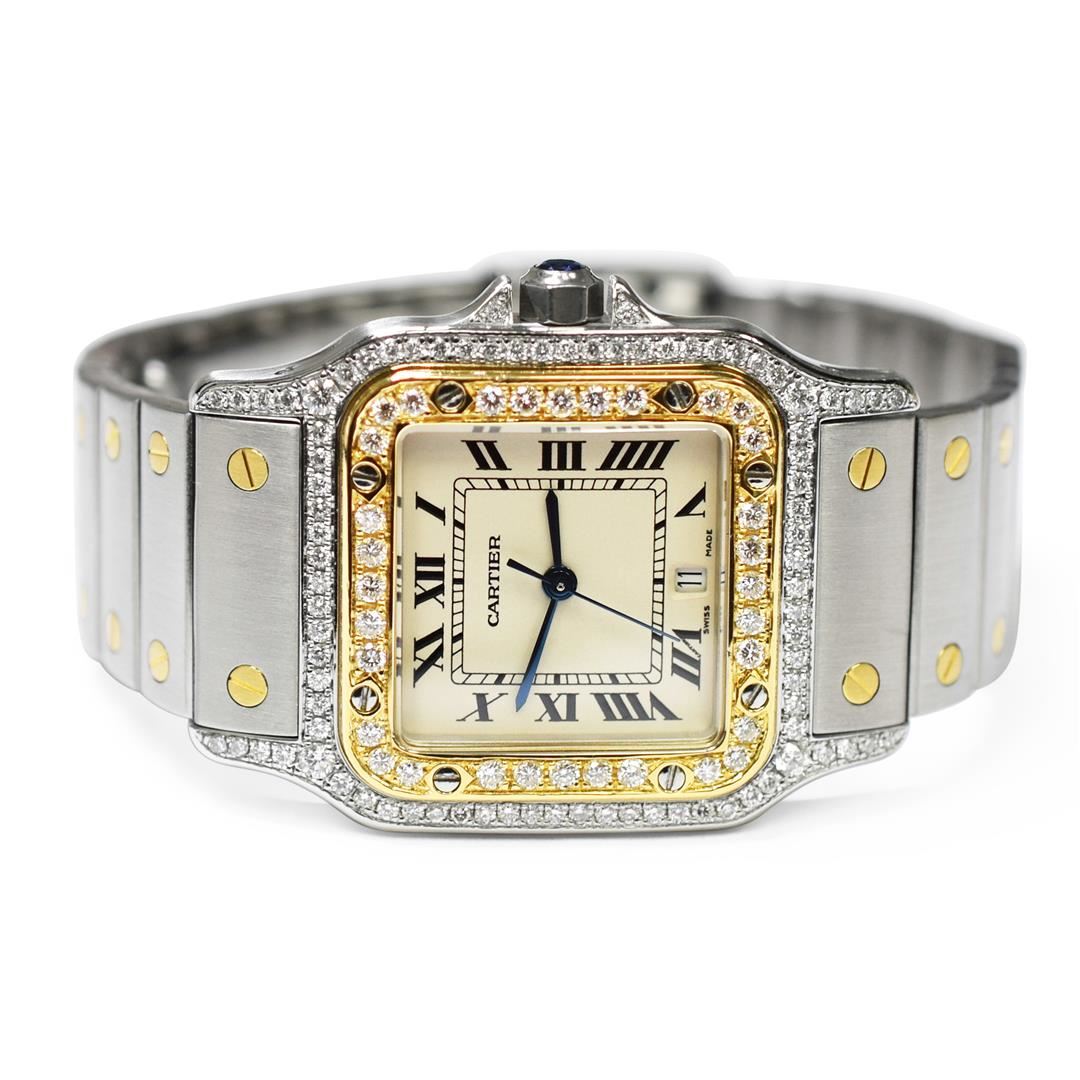 Cartier Santos Galbée Lady 29mm Silver Roman Dial 18KT Yellow Gold & Steel Polished & Electronically Tested. Model: Santos Galbee 1566. Case: Stainless Steel and 18KT Gold. Total Weight 2.00ctw Clarity: VS-SI Color:G-H. Crystal: Sapphire. Bracelet: Stainless Steel and 18KT Gold. Dial: Original Silver Color with Roman Numerals. Date Window: 6 O'clock Position date display. Movement: Quartz Battery. Water Resistant: Yes. Case Size: 29mm, Condition: Pre Owned, Watch is free of all Scratches and Dents, Extra Fine G-6.