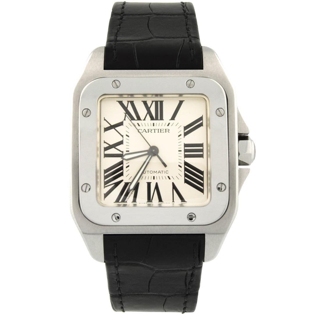Cartier Mens Santos 100 Stainless Steel 41x51mm Silver Roman Dial Watch Polished & Electronically Tested. Model: Santos 100. Case: Stainless Steel. Crystal: Sapphire Crystal. Bracelet: Leather Strap. Dial: Silver Roman Dial. Movement: Automatic Winding Movement. Water Resistant: Yes. Case Size: 41x51mm. Condition: Pre Owned, Watch is free of all Scratches and Dents, Near Mint G-7.