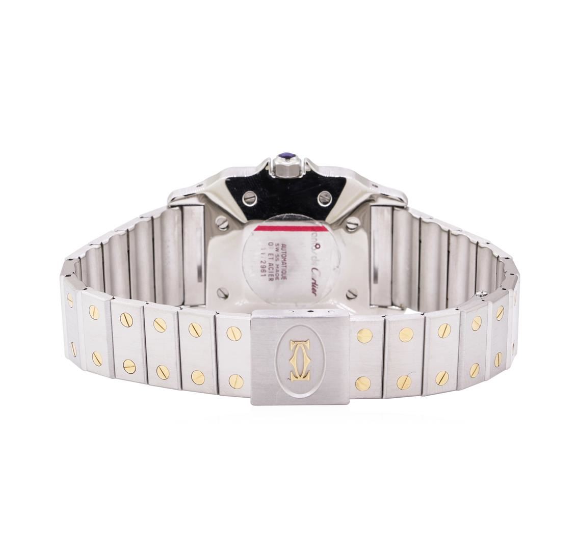 One man's, hand crafted and machine milled Cartier square case with diamonds Santos Galbee wrist watch electronically tested stainless steel and 18KT gold, Case: 29mm, Crown: sapphire set pull out, Bezel: custom diamond set, Crystal: synthetic sapphire, Movement: automatic, Dial: glossy white with baton, pointed type hands and roman numerals, Calendar: 3 o'clock, Bracelet: two tone matching with screw heads, Condition: G-6 extra fine. Containing: Thirty-Six prong set round brilliant cut diamonds, measuring 2.00 - 1.80 x 1.18mm (depth est.) approximate total weight of 36 Stones = 0.95ct. Graded in the setting. Color G - H, Clarity VS-1 to VS-2, Cut Very Good Seventy-Six prong set round brilliant cut diamonds, measuring 1.35 - 1.30 x 0.82mm (depth est.) approximate total weight of 76 Stones = 0.66ct. Graded in the setting. Color G - H, Clarity VS-1 to VS-2, Cut Very Good. Total Weight of Diamonds 1.61ct. Total Weight of Watch 86.40gm. GAS Appraised.
