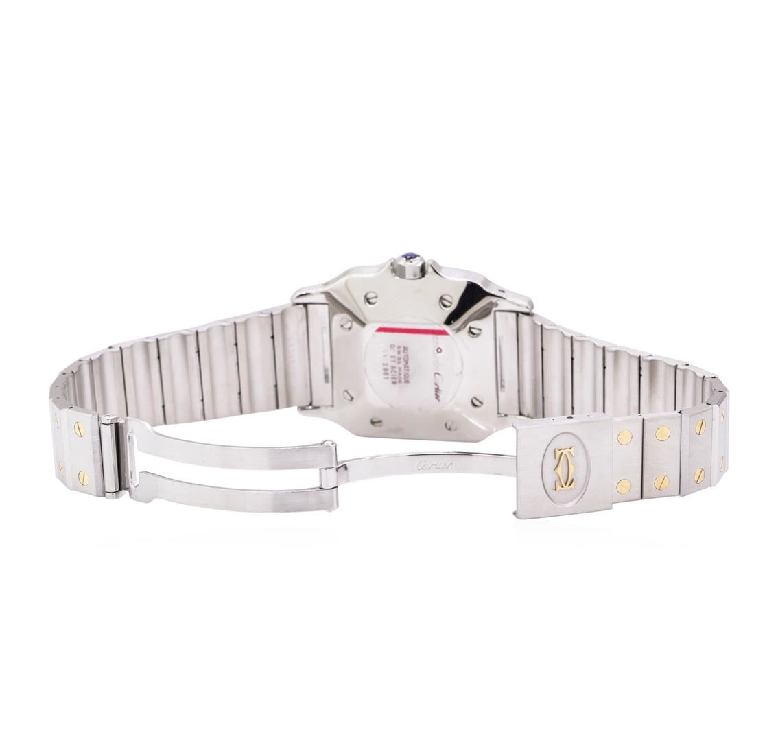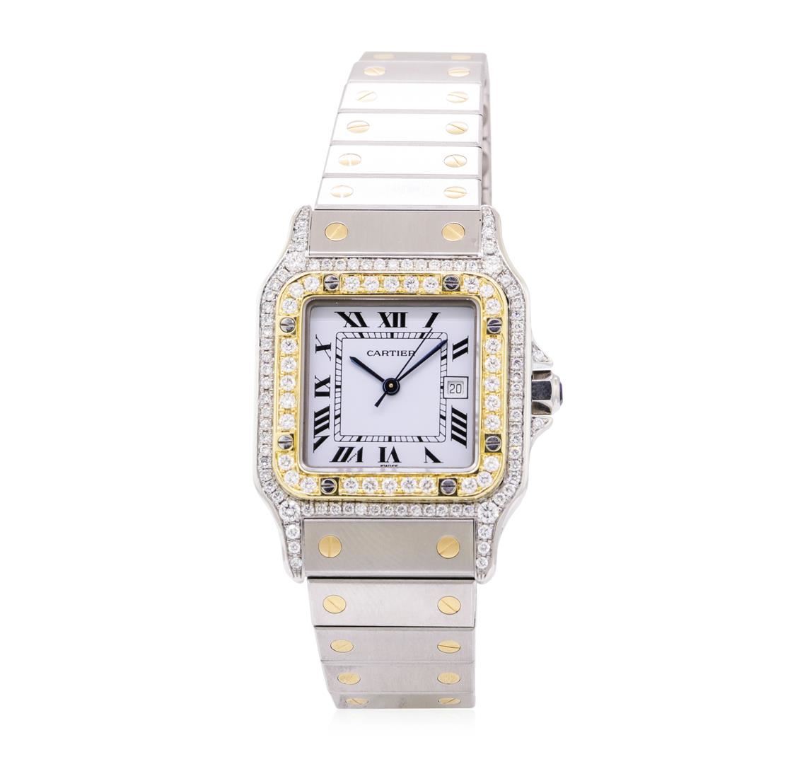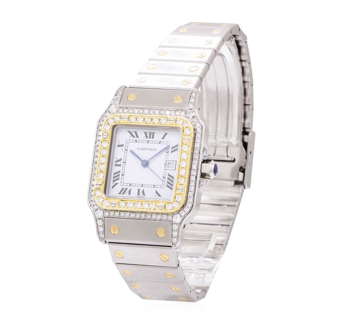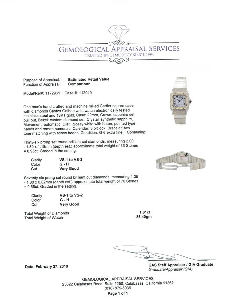 One man's, hand crafted and machine milled Cartier square case with diamonds Santos Galbee wrist watch electronically tested stainless steel and 18KT gold, Case: 29mm, Crown: sapphire set pull out, Bezel: custom diamond set, Crystal: synthetic sapphire, Movement: automatic, Dial: glossy white with baton, pointed type hands and roman numerals, Calendar: 3 o'clock, Bracelet: two tone matching with screw heads, Condition: G-6 extra fine. Containing: Thirty-Six prong set round brilliant cut diamonds, measuring 2.00 - 1.80 x 1.18mm (depth est.) approximate total weight of 36 Stones = 0.95ct. Graded in the setting. Color G - H, Clarity VS-1 to VS-2, Cut Very Good Seventy-Six prong set round brilliant cut diamonds, measuring 1.35 - 1.30 x 0.82mm (depth est.) approximate total weight of 76 Stones = 0.66ct. Graded in the setting. Color G - H, Clarity VS-1 to VS-2, Cut Very Good. Total Weight of Diamonds 1.61ct. Total Weight of Watch 86.40gm. GAS Appraised.