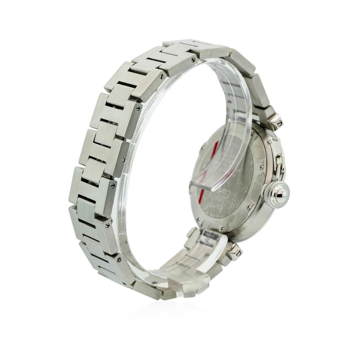 Cartier Mens Stainless Steel Pasha Watch. The watch is in good working condition and contains the following attributes: Case: 36 mm stainless steel, Bezel: Stainless Steel Fixed Bezel, Dial: White dial with black Arabic numerals and gold hour markers with Date display, Bracelet: Stainless steel bracelet with hidden double folding clasp; and will fit up to a 7 inch wrist. Automatic movement. Sapphire crystal. Reference 1031.