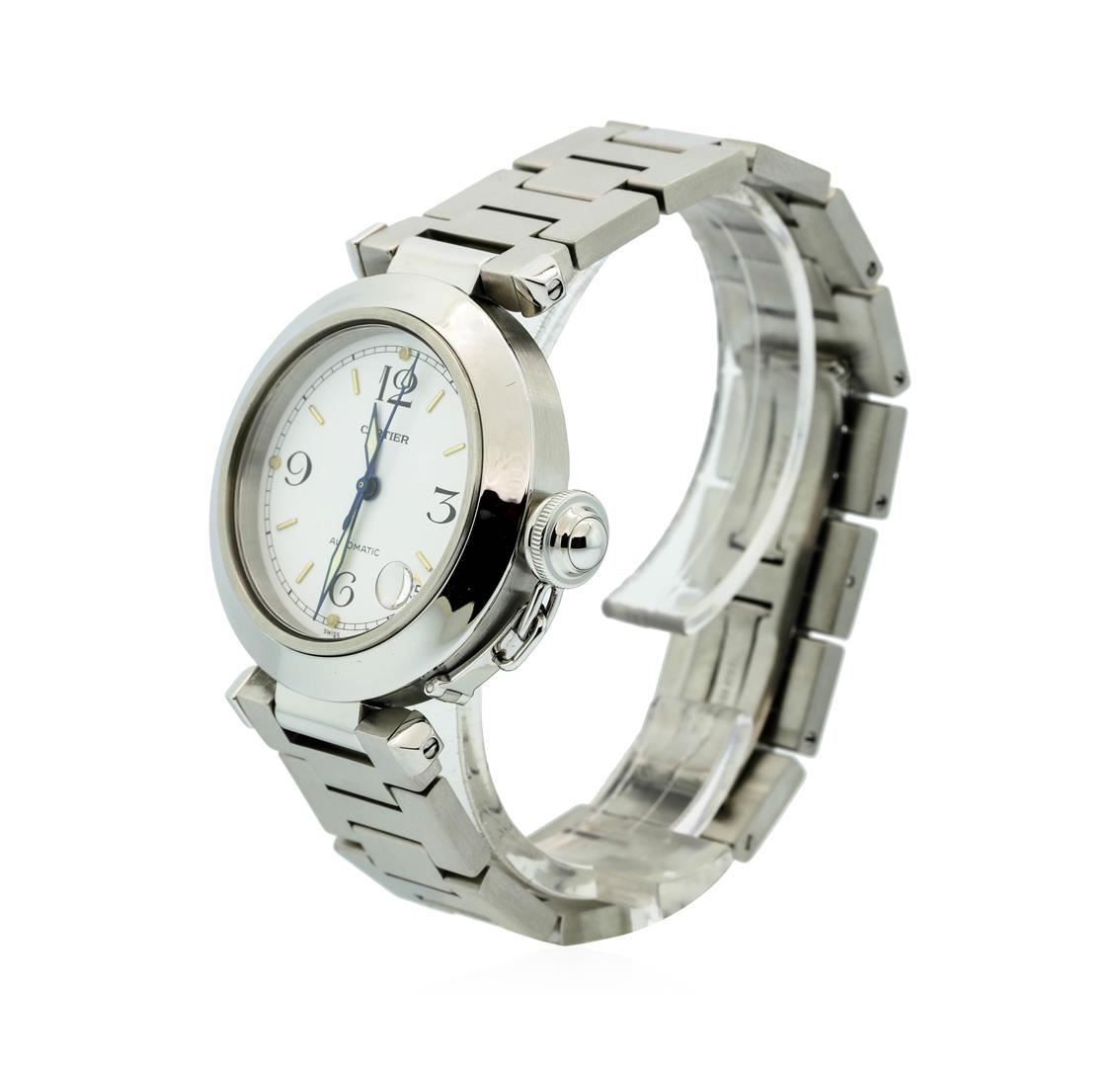 Cartier Mens Stainless Steel Pasha Watch. The watch is in good working condition and contains the following attributes: Case: 36 mm stainless steel, Bezel: Stainless Steel Fixed Bezel, Dial: White dial with black Arabic numerals and gold hour markers with Date display, Bracelet: Stainless steel bracelet with hidden double folding clasp; and will fit up to a 7 inch wrist. Automatic movement. Sapphire crystal. Reference 1031.