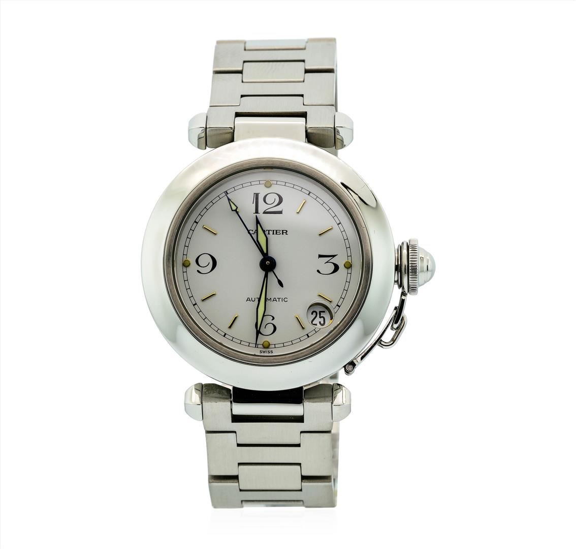 Cartier Mens Stainless Steel Pasha Watch. The watch is in good working condition and contains the following attributes: Case: 36 mm stainless steel, Bezel: Stainless Steel Fixed Bezel, Dial: White dial with black Arabic numerals and gold hour markers with Date display, Bracelet: Stainless steel bracelet with hidden double folding clasp; and will fit up to a 7 inch wrist. Automatic movement. Sapphire crystal. Reference 1031.