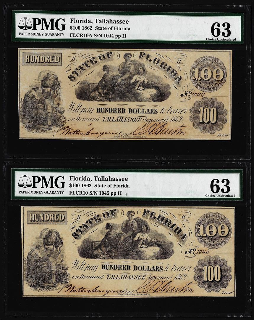 Change Over Pair of 1862 $100 State of Florida Cr.10/10A Obsolete Notes PMG Choice Uncirculated 63. A very nice pair of Florida state issue $100s that qualify as a "crossover pair." The first note, with serial number 1044, displays plate letter H with a cross bar while the second piece, with serial number 1045, is the variety where the plate letter H does not have a cross bar. PMG Certified.