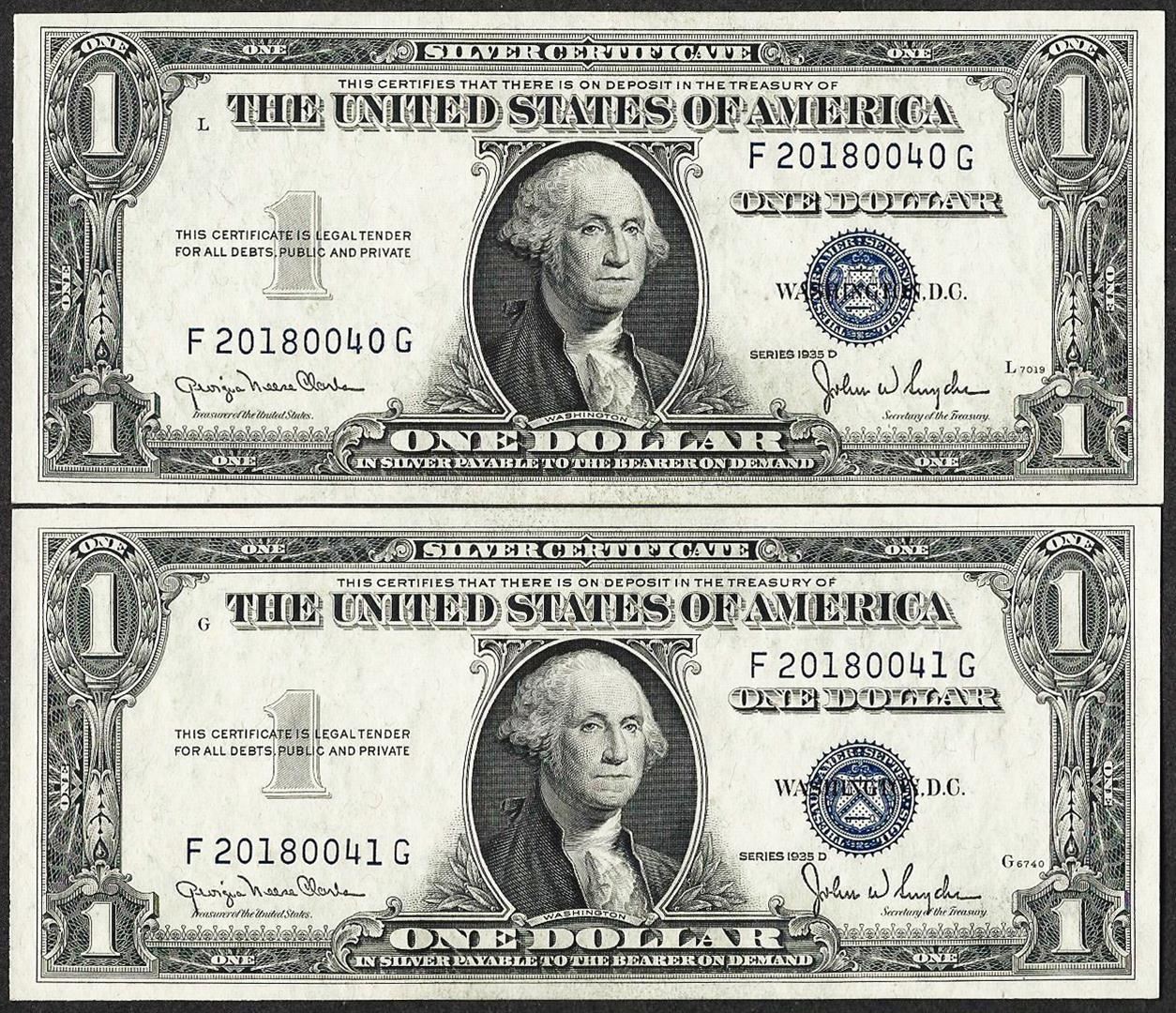 One Changeover Pair of 1935D Wide- Narrow $1 Silver Certificate Notes.