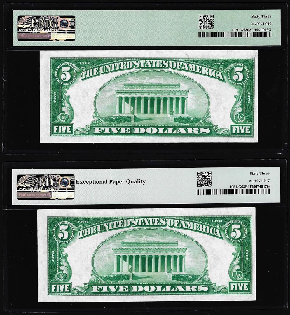 One Changover Pair of 1928 & 1928A $5 Federal Reserve Notes Chicago Fr.1950-G & 1951-G PMG Choice Uncirculated 63/63EPQ PMG Certified.