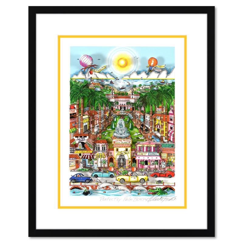 "Perfectly Palm Beach" is a 3D limited edition silk screen construct on paper by Charles Fazzino, DX numbered 223/300 and hand signed by the artist. This piece comes custom framed. Includes Certificate of Authenticity. Measures approximately 19" x 23.5" (frame), 11" x 14" (image).