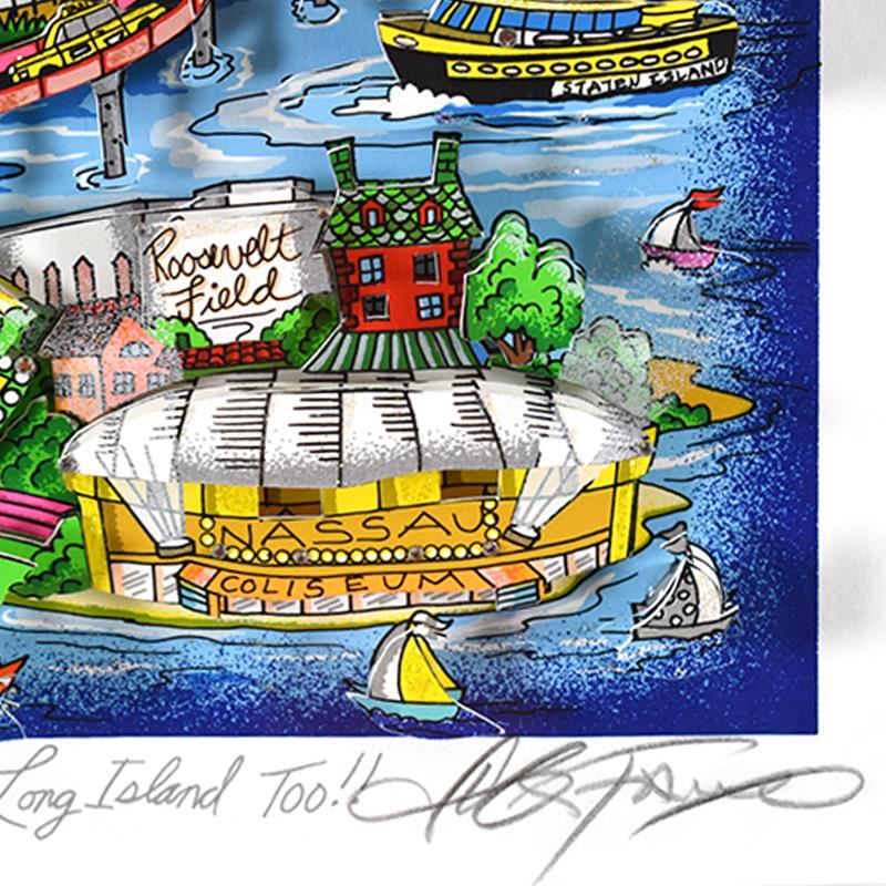 "There's Music In NY, NJ, & LI Too" is a 3D limited edition silk screen construct on paper by Charles Fazzino, DX numbered 91/100 and hand signed by the artist. This piece comes custom framed. Includes Certificate of Authenticity. Measures approximately 23" x 27.5" (framed), 15" x 20" (image).