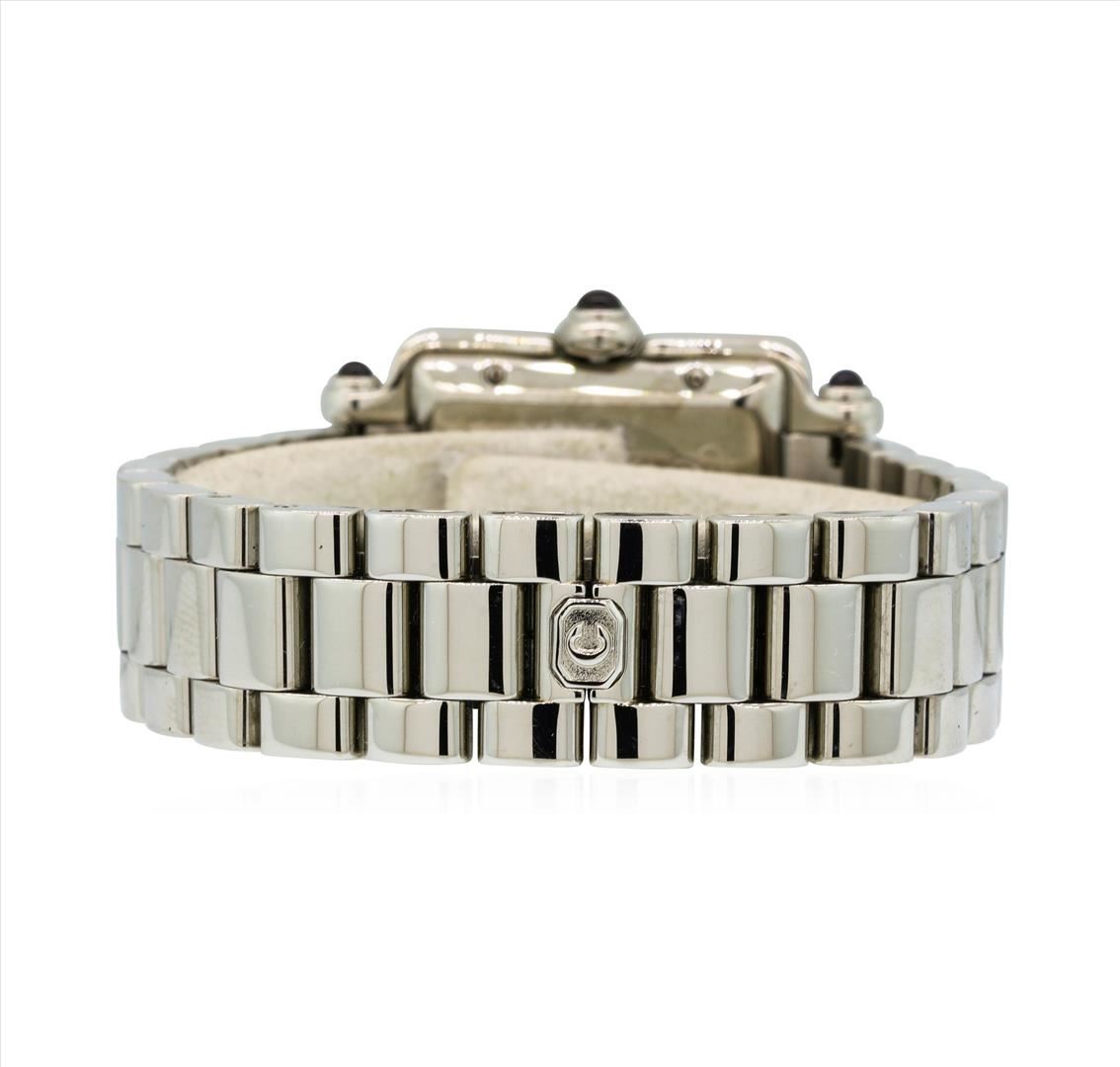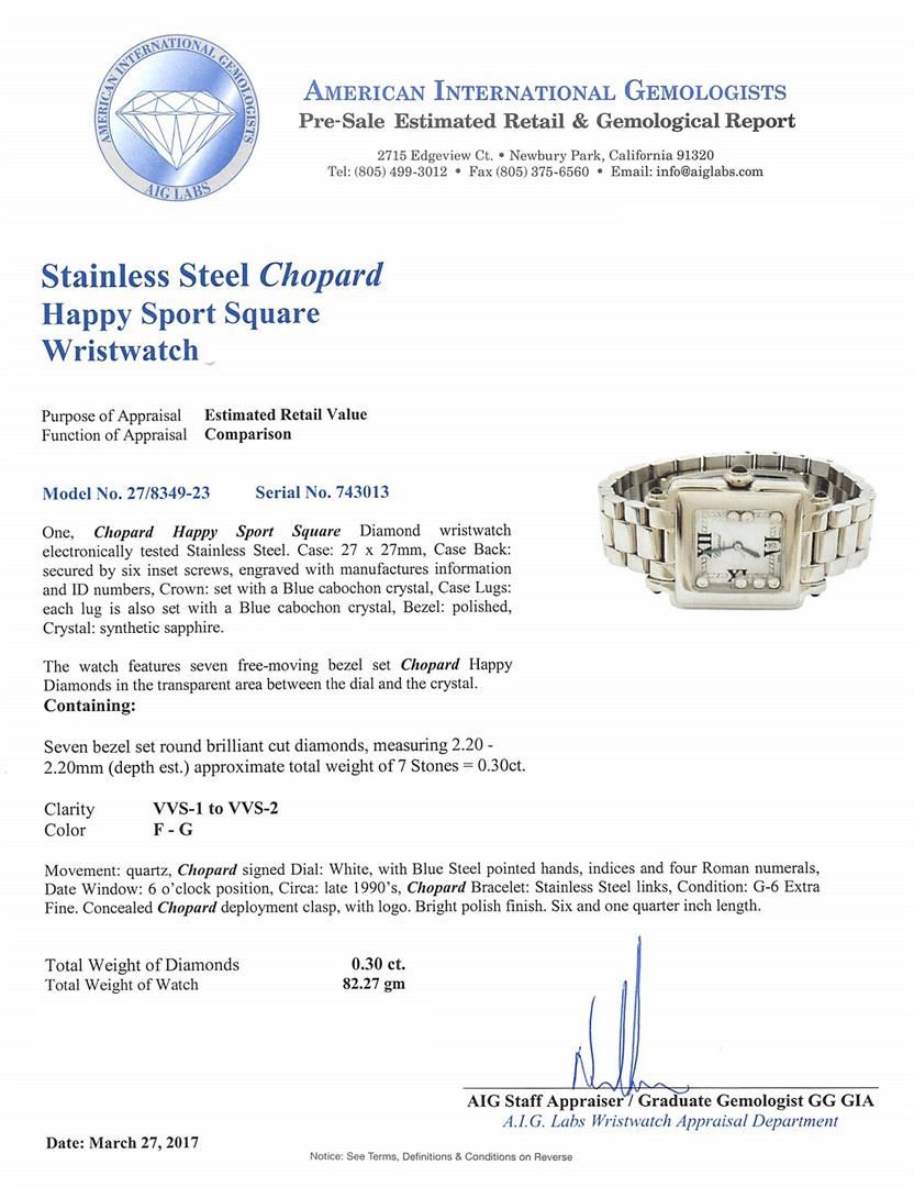 One, Chopard Happy Sport Square Diamond wristwatch electronically tested Stainless Steel. Case: 27 x 27mm, Case Back: secured by six inset screws, engraved with manufactures information and ID numbers, Crown: set with a Blue cabochon crystal, Case Lugs: each lug is also set with a Blue cabochon crystal, Bezel: polished, Crystal: synthetic sapphire. The watch features seven free-moving bezel set Chopard Happy Diamonds in the transparent area between the dial and the crystal. Containing: Seven bezel set round brilliant cut diamonds, measuring 2.20 - 2.20mm (depth est.) approximate total weight of 7 Stones = 0.30ct. Clarity VVS-1 to VVS-2 Color F - G Movement: quartz, Chopard signed Dial: White, with Blue Steel pointed hands, indices and four Roman numerals, Date Window: 6 o'clock position, Circa: late 1990's, Chopard Bracelet: Stainless Steel links, Condition: G-6 Extra Fine. Concealed Chopard deployment clasp, with logo. Bright polish finish. Six and one quarter inch length. Total Weight of Diamonds 0.30ct. Total Weight of Watch 82.27gm. AIG Appraised.