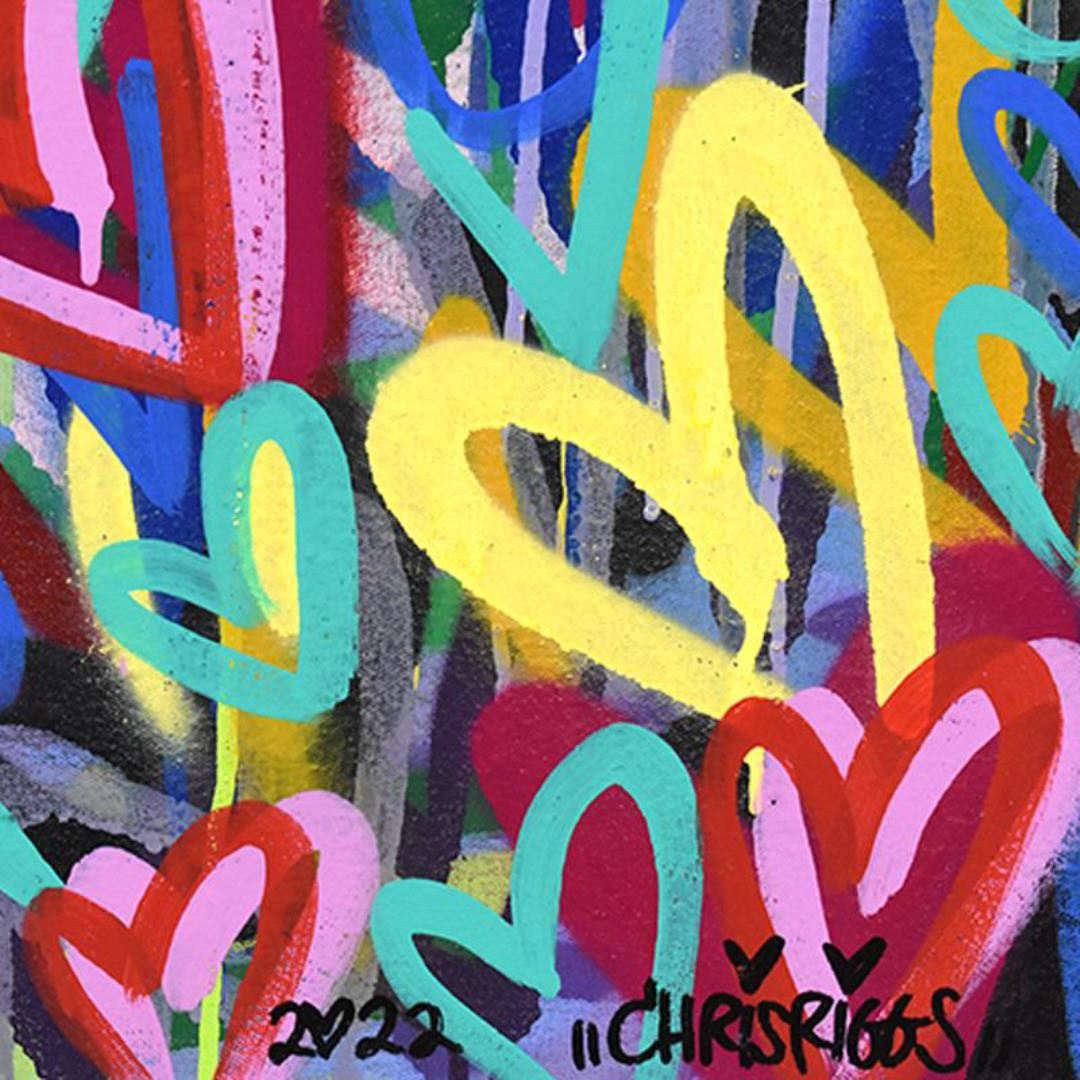 "Love" is an original spray paint painting on canvas by Chris Riggs, hand signed by the artist. This piece comes gallery wrapped. Includes Letter of Authenticity. Measures approx. 36" x 39" (image).