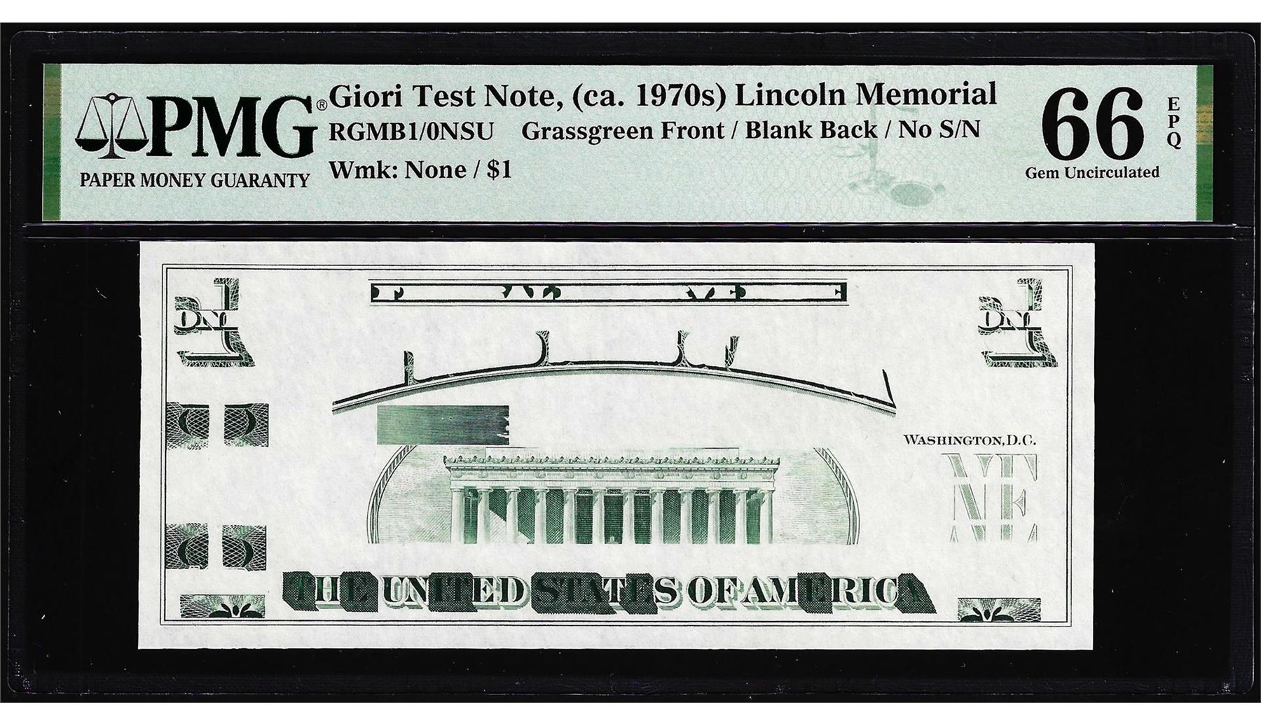 One Circa 1970's Lincoln Memorial Giori Test Note PMG Gem Uncirculated 66EPQ. PMG Certified.