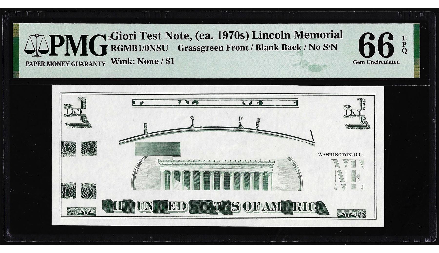 One Circa 1970's Lincoln Memorial Giori Test Note PMG Gem Uncirculated 66EPQ. PMG Certified.