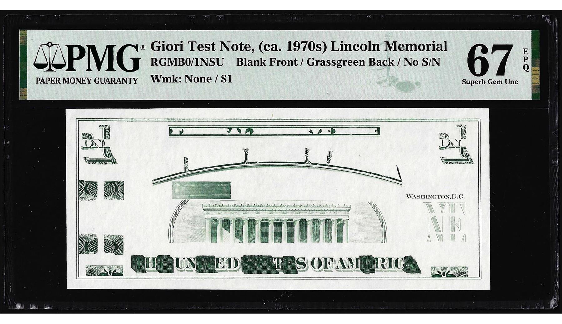 One Circa 1970's Lincoln Memorial Giori Test Note PMG Superb Gem Uncirculated 67EPQ. PMG Certified.