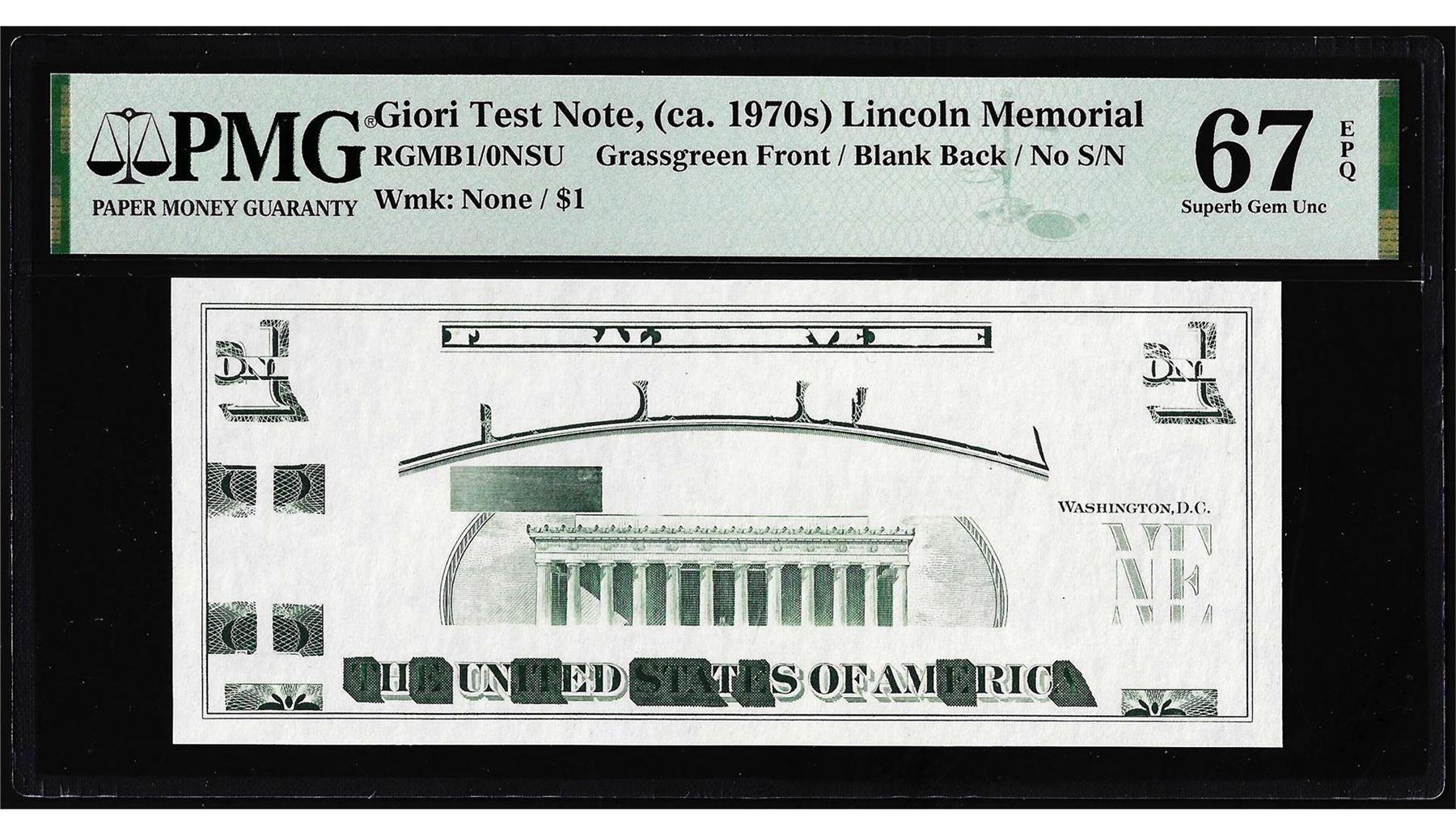 One Circa 1970's Lincoln Memorial Giori Test Note PMG Superb Gem Uncirculated 67EPQ. PMG Certified.