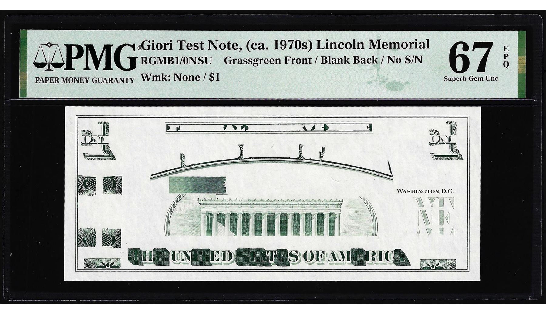 One Circa 1970's Lincoln Memorial Giori Test Note PMG Superb Gem Uncirculated 67EPQ. PMG Certified.