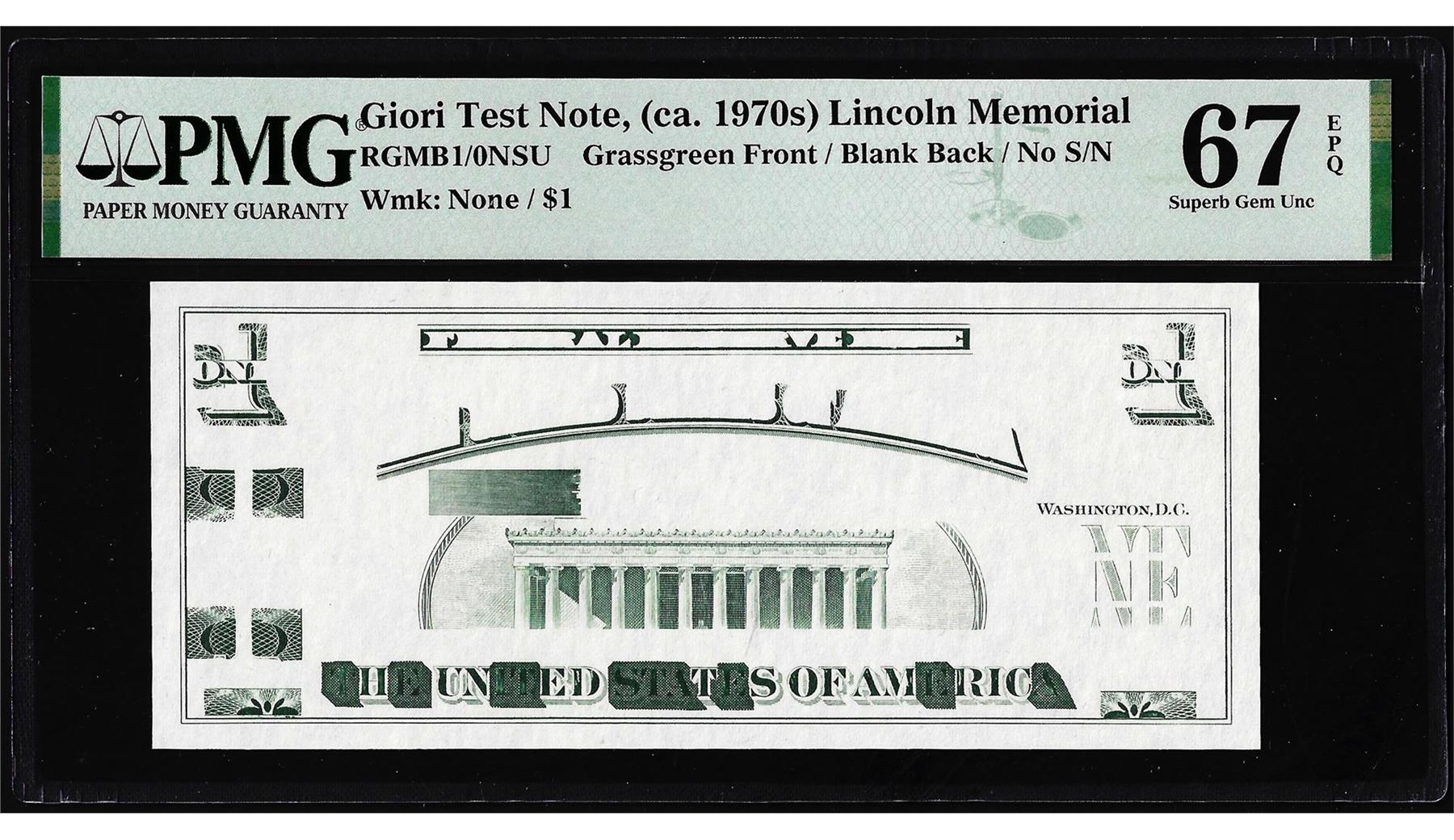 One Circa 1970's Lincoln Memorial Giori Test Note PMG Superb Gem Uncirculated 67EPQ. PMG Certified.