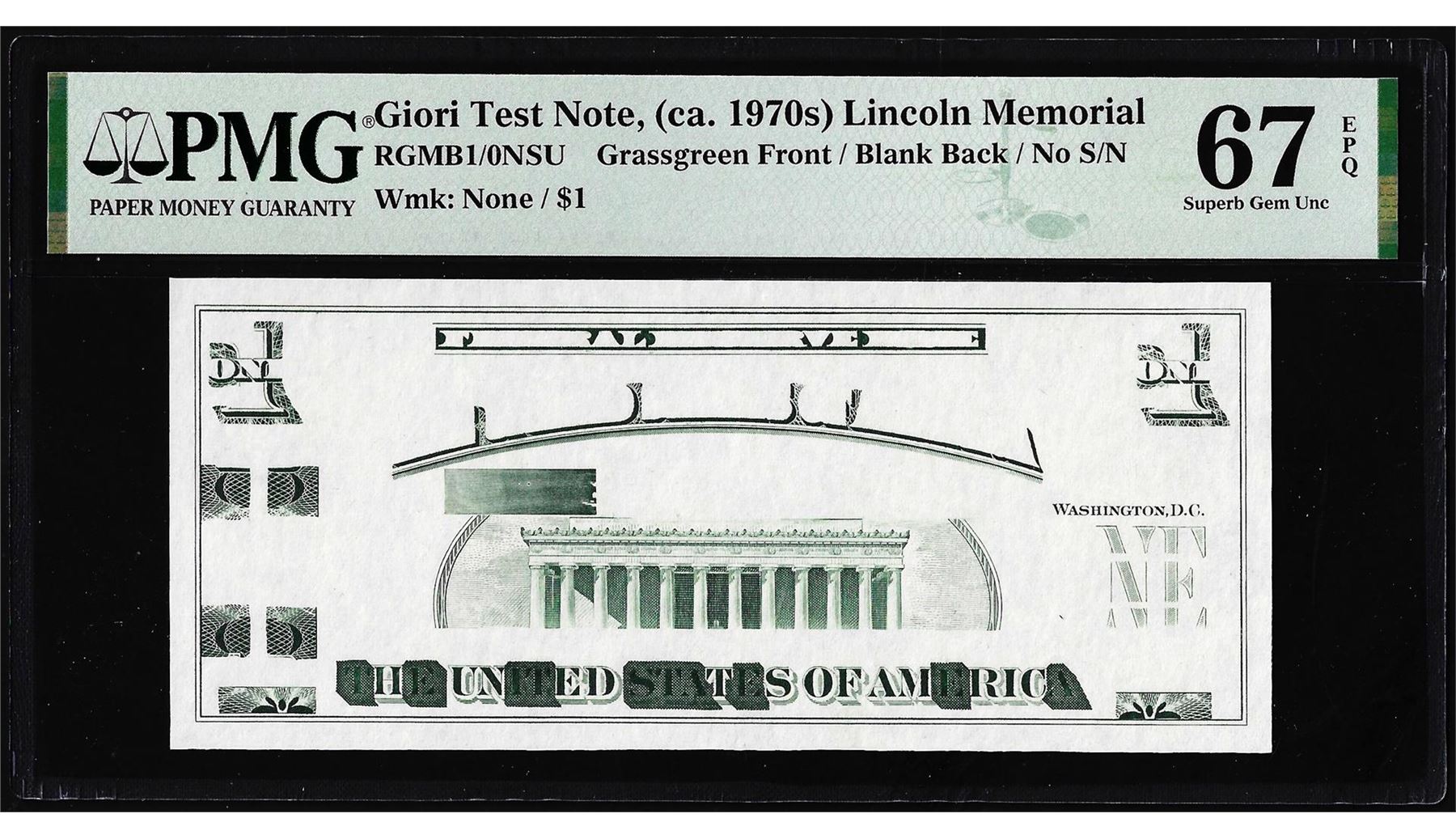 One Circa 1970's Lincoln Memorial Giori Test Note PMG Superb Gem Uncirculated 67EPQ. PMG Certified.