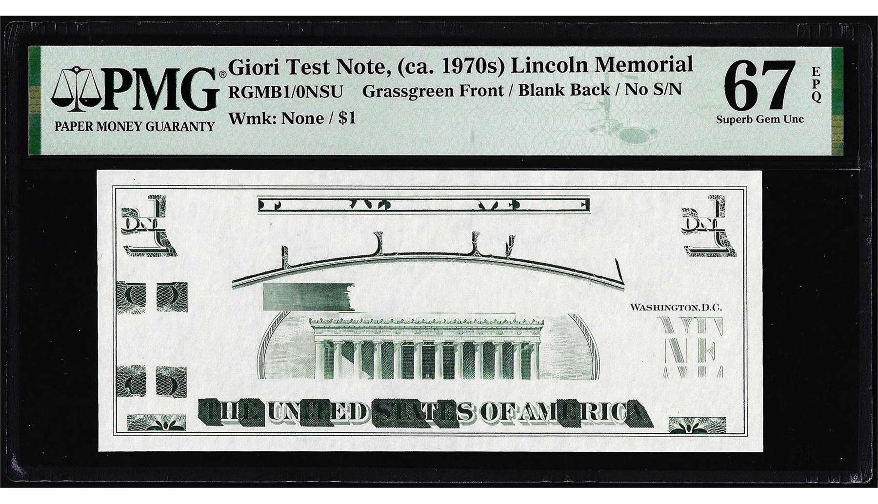 One Circa 1970's Lincoln Memorial Giori Test Note PMG Superb Gem Uncirculated 67EPQ. PMG Certified.