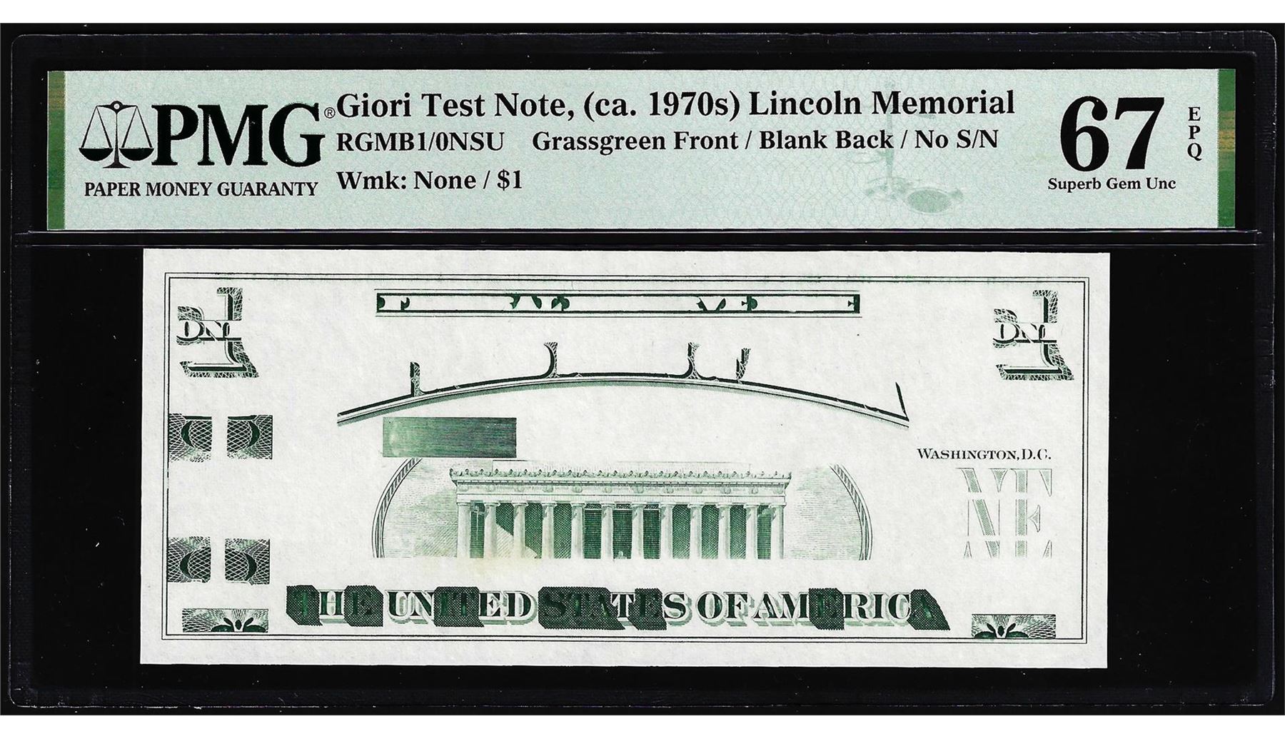 One Circa 1970's Lincoln Memorial Giori Test Note PMG Superb Gem Uncirculated 67EPQ. PMG Certified.