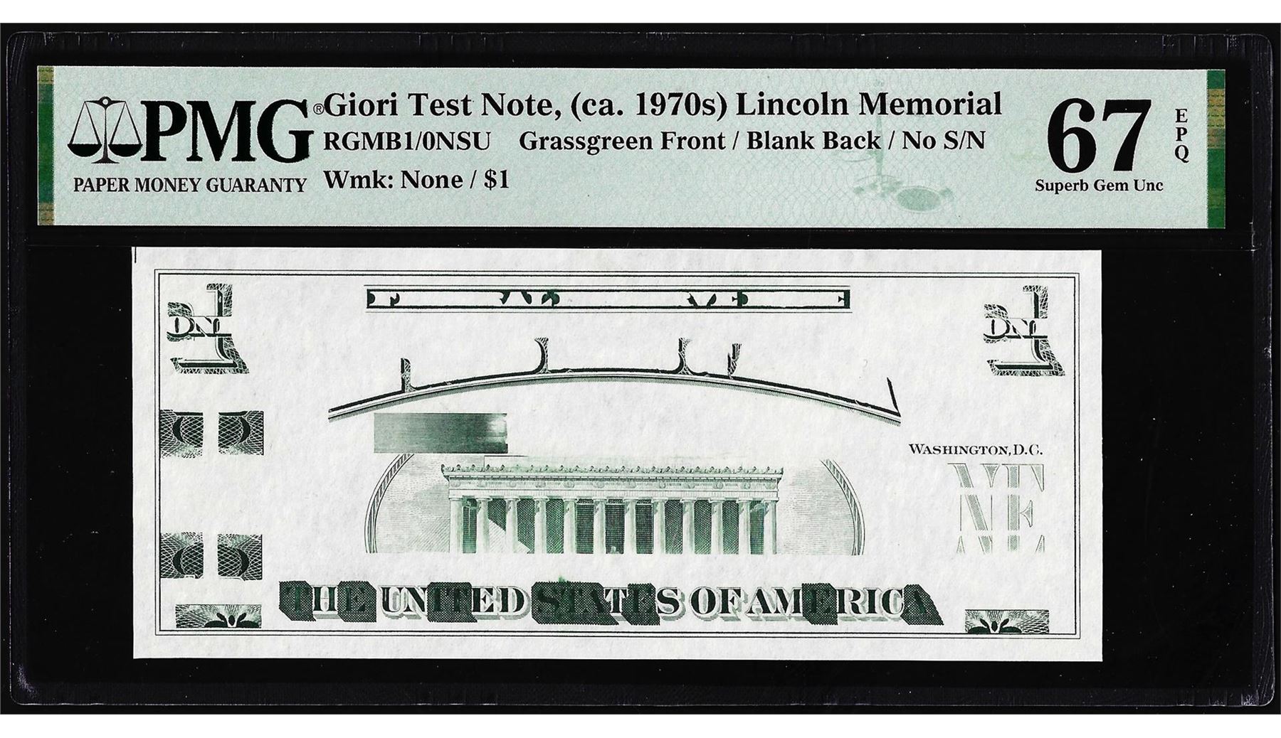 One Circa 1970's Lincoln Memorial Giori Test Note PMG Superb Gem Uncirculated 67EPQ. PMG Certified.