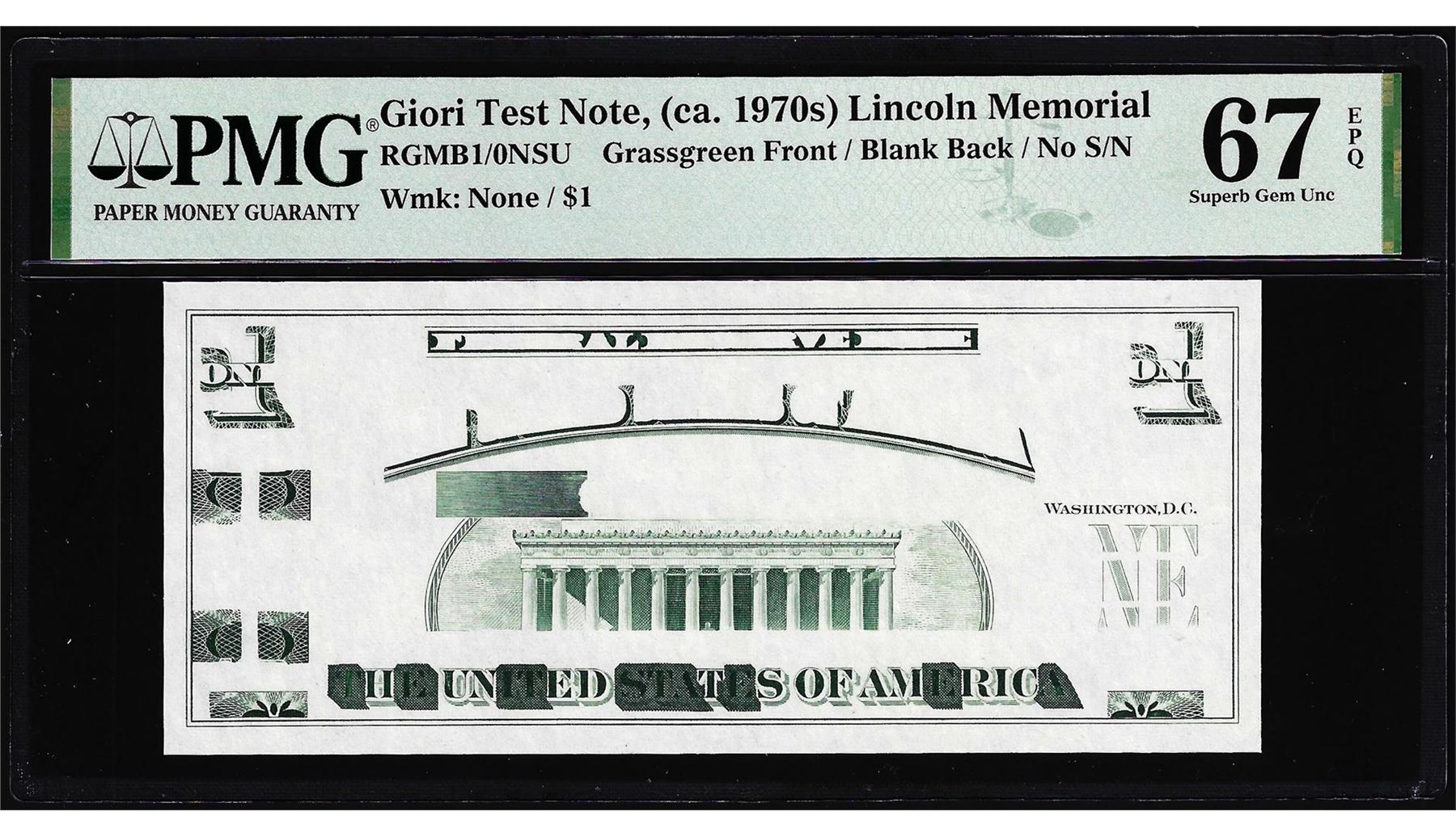 One Circa 1970's Lincoln Memorial Giori Test Note PMG Superb Gem Uncirculated 67EPQ. PMG Certified.