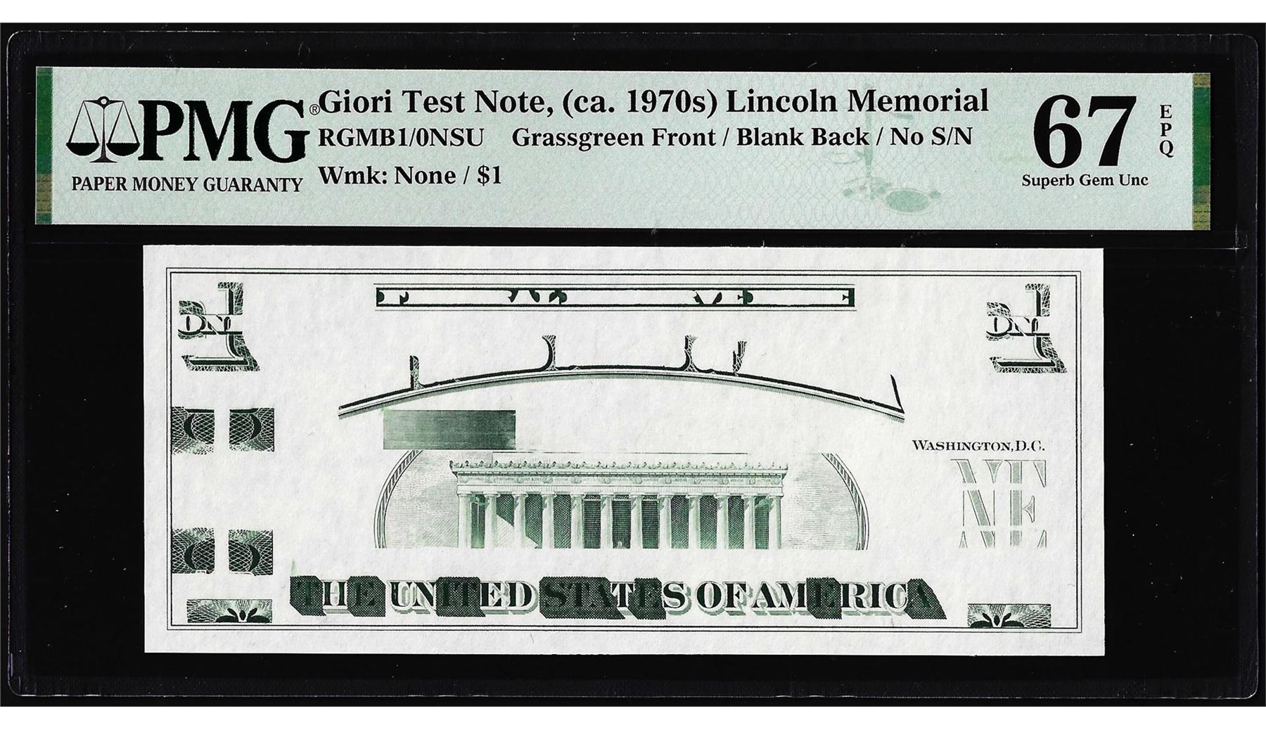 One Circa 1970's Lincoln Memorial Giori Test Note PMG Superb Gem Uncirculated 67EPQ. PMG Certified.