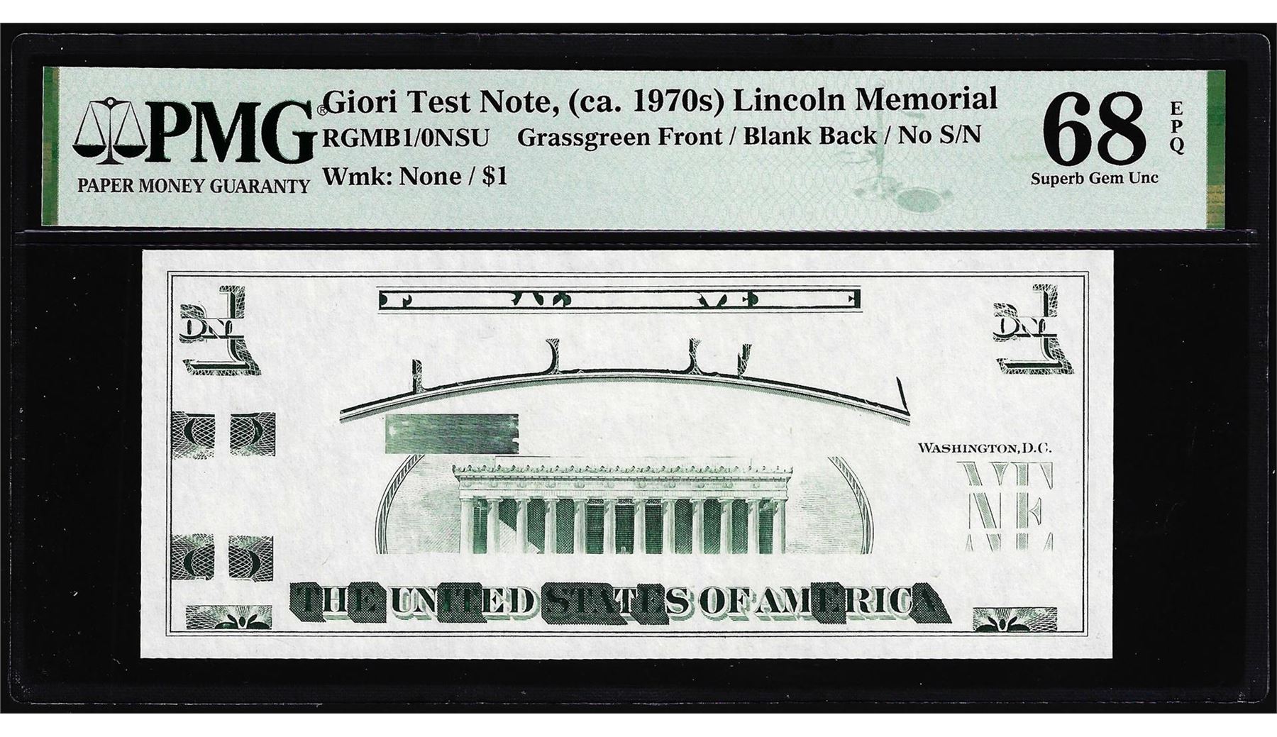 One Circa 1970's Lincoln Memorial Giori Test Note PMG Superb Gem Uncirculated 68EPQ. PMG Certified.