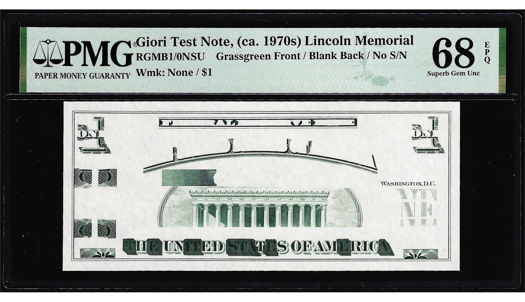 One Circa 1970's Lincoln Memorial Giori Test Note PMG Superb Gem Uncirculated 68EPQ. PMG Certified.