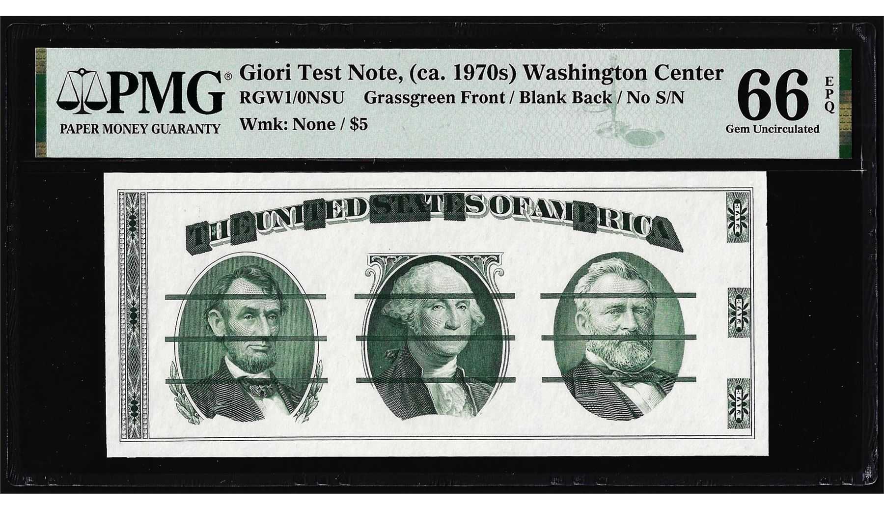 One Circa 1970's Washington Center Giori Test Note PMG Gem Uncirculated 66EPQ. PMG Certified.