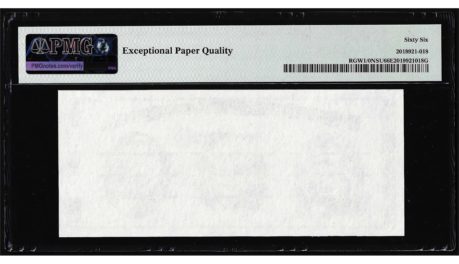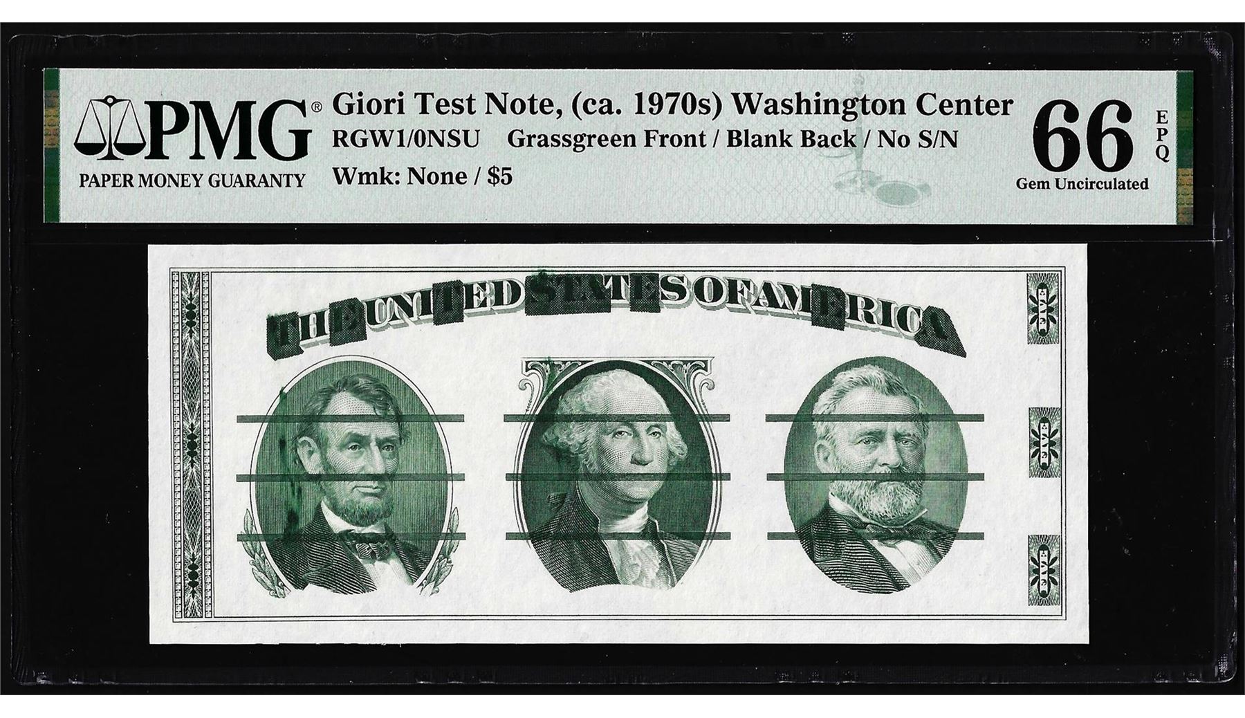 One Circa 1970's Washington Center Giori Test Note PMG Gem Uncirculated 66EPQ. PMG Certified.