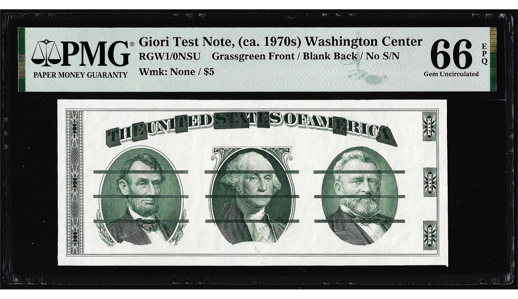 One Circa 1970's Washington Center Giori Test Note PMG Gem Uncirculated 66EPQ. PMG Certified.