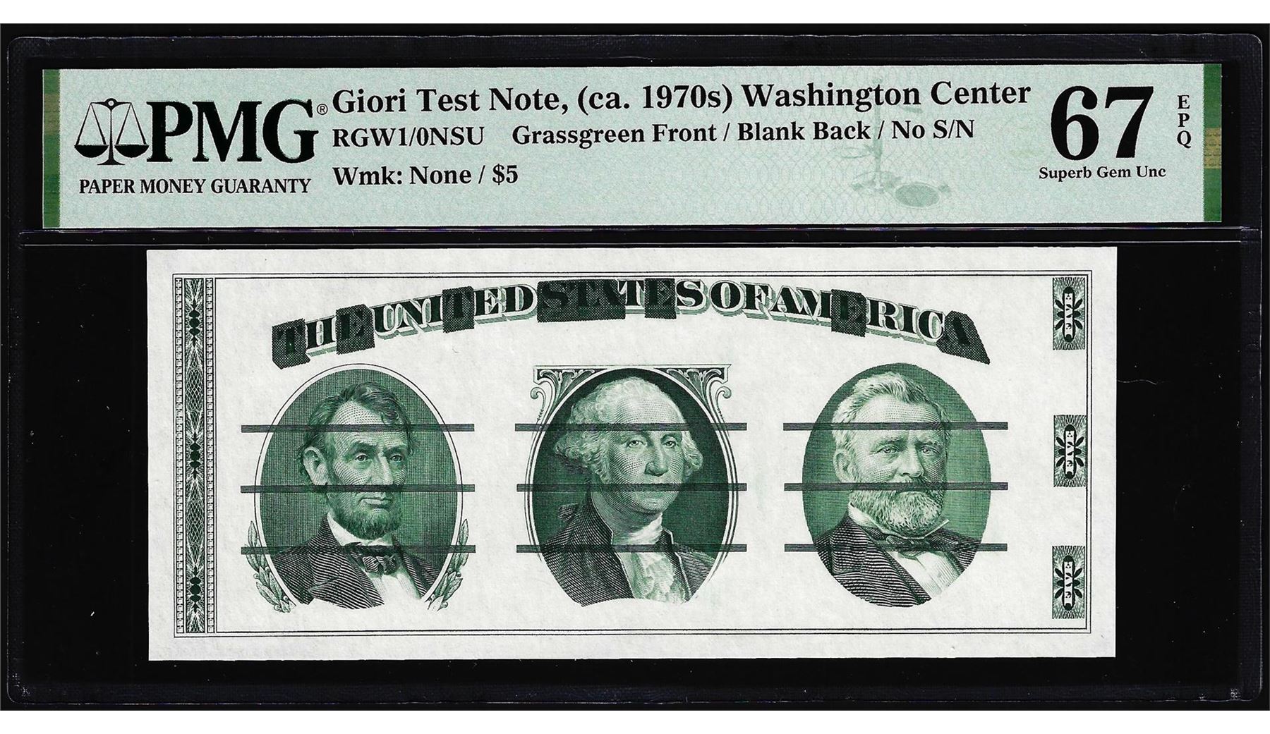 One Circa 1970's Washington Center Giori Test Note PMG Superb Gem Uncirculated 67EPQ. PMG Certified.