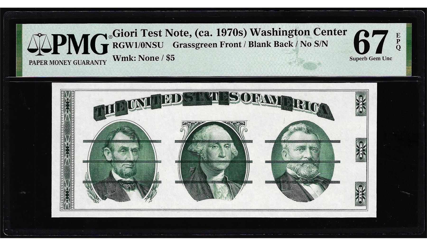 One Circa 1970's Washington Center Giori Test Note PMG Superb Gem Uncirculated 67EPQ. PMG Certified.