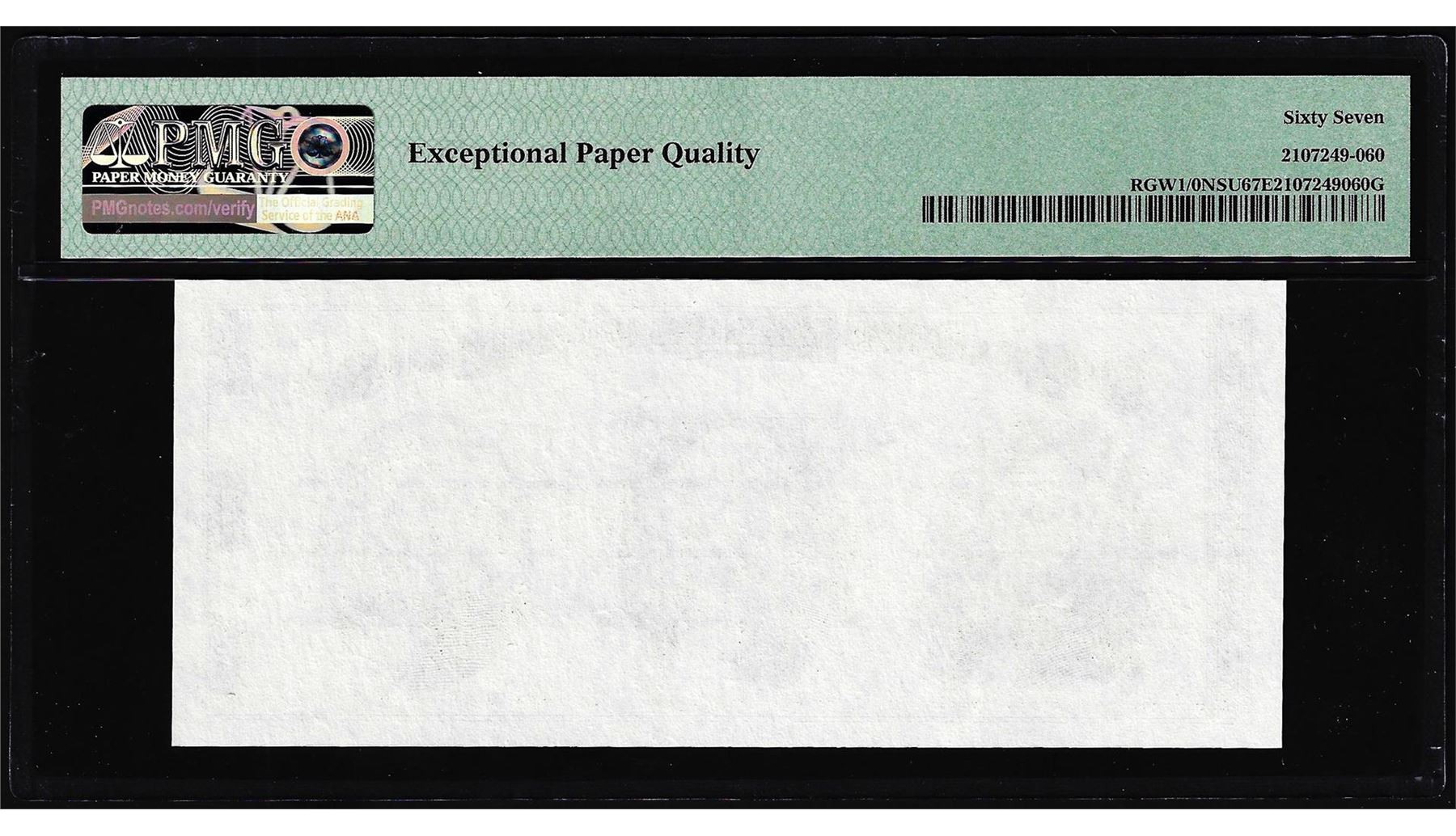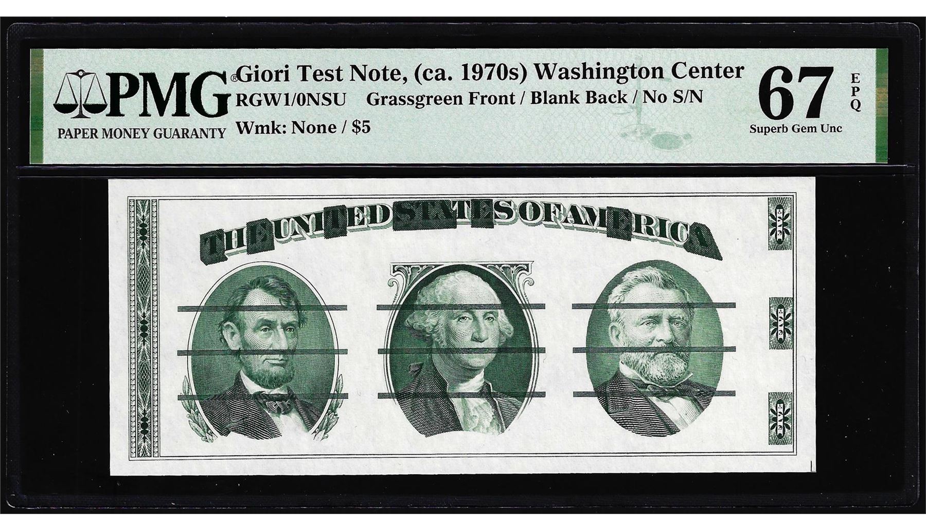 One Circa 1970's Washington Center Giori Test Note PMG Superb Gem Uncirculated 67EPQ. PMG Certified.
