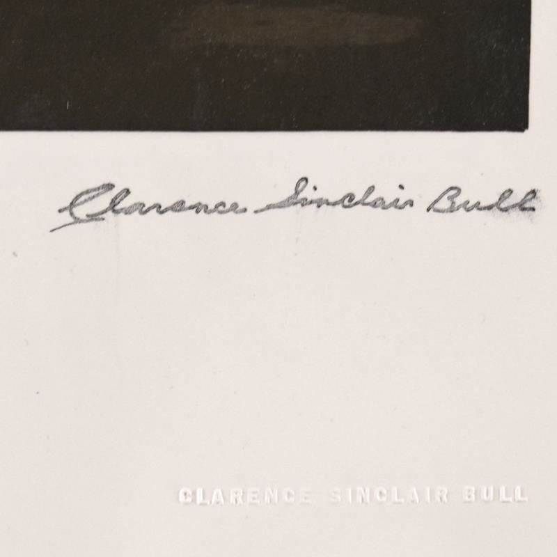 "Greta Garbo" is a limited edition photograph on paper by Clarence Sinclair Bull (1895-1979), numbered and stamp signed by the estate. This photograph is from the original negative. This piece bears inverso the Official Clarence Sinclair Bull Stamp and Includes Letter of Authenticity. Measures approx. 16" x 20" (border), 11" x 14" (image). Due to the age and improper storage of this piece the paper is wavy and there may be other imperfections such as smudging on the signature; the piece however is overall presentable.