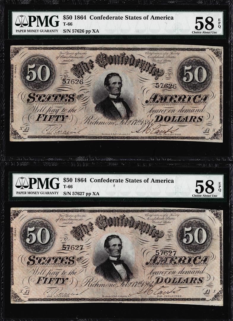 Consecutive 1864 $50 Confederate States of America Notes PMG About Uncirculated 58EPQ