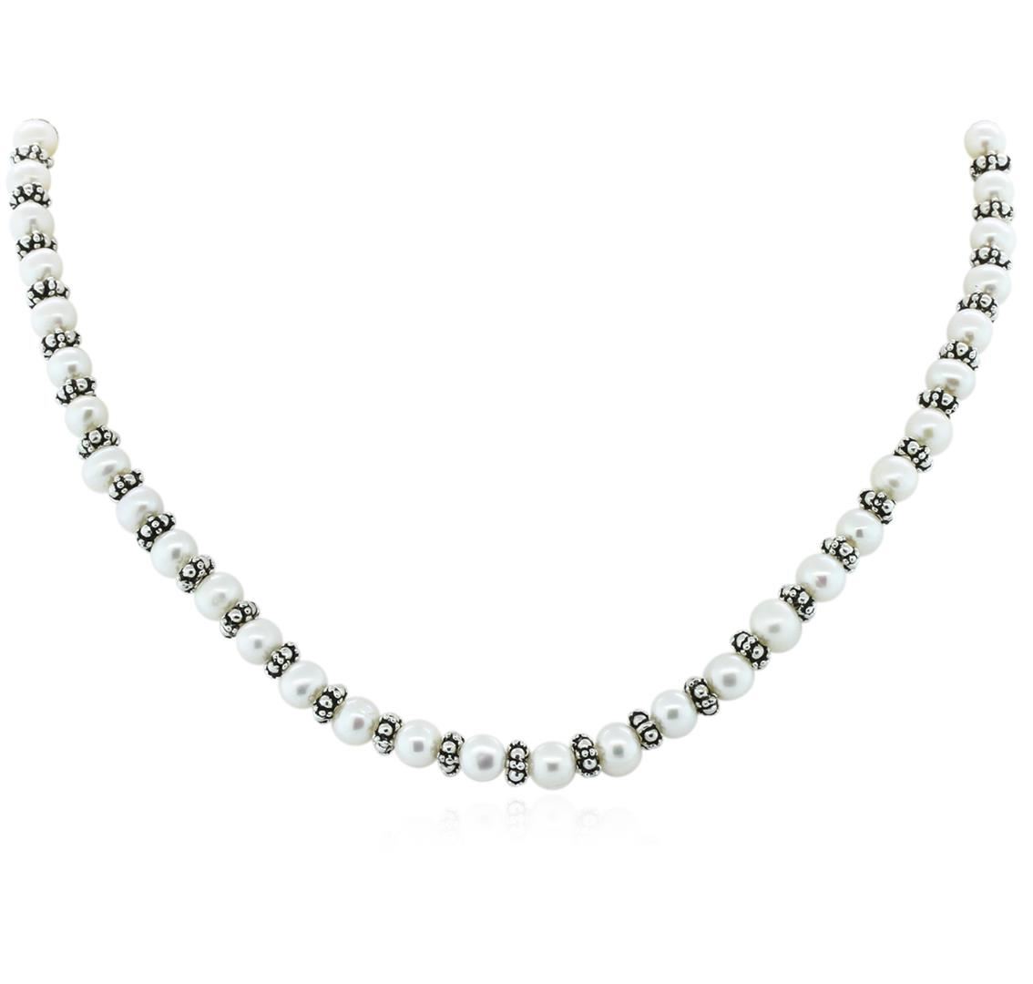 One white cultured pearl necklace, stretch bracelet that adjusts to different wrist sizes, and matching earrings. The pearls in this set measure approximately 5.5-7 mm. Good condition.