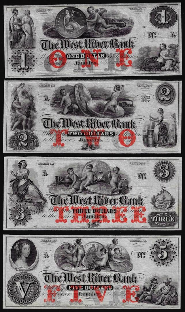 One Cut Sheet of $1/$2/$3/$5 The West River Bank Obsolete Notes.