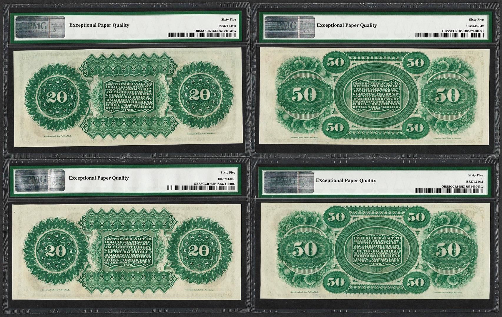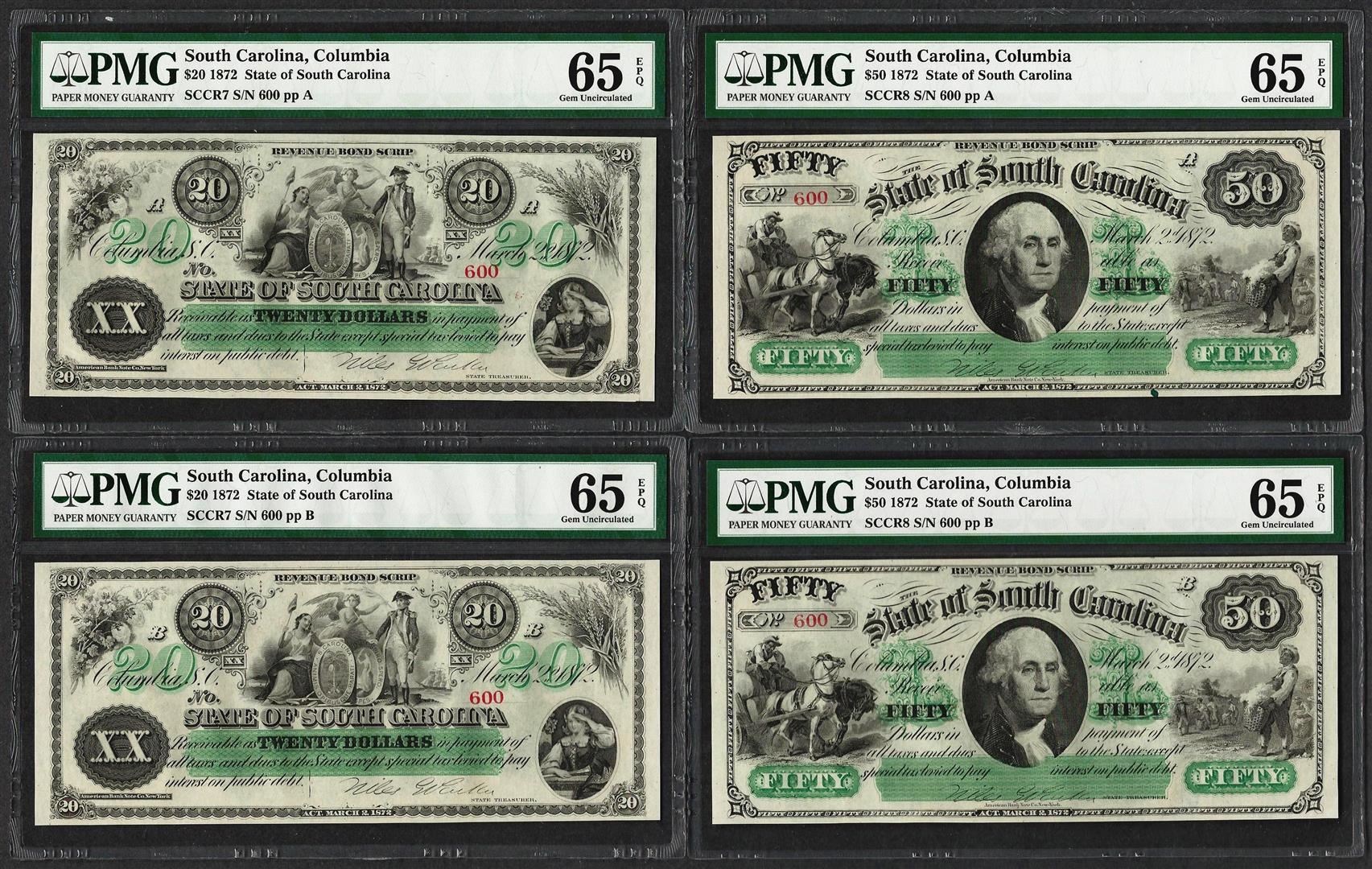 One Cut Sheet of 1872 $20 & $50 State of South Carolina Obsolete Notes PMG Gem Unc. 65EPQ. PMG Certified.