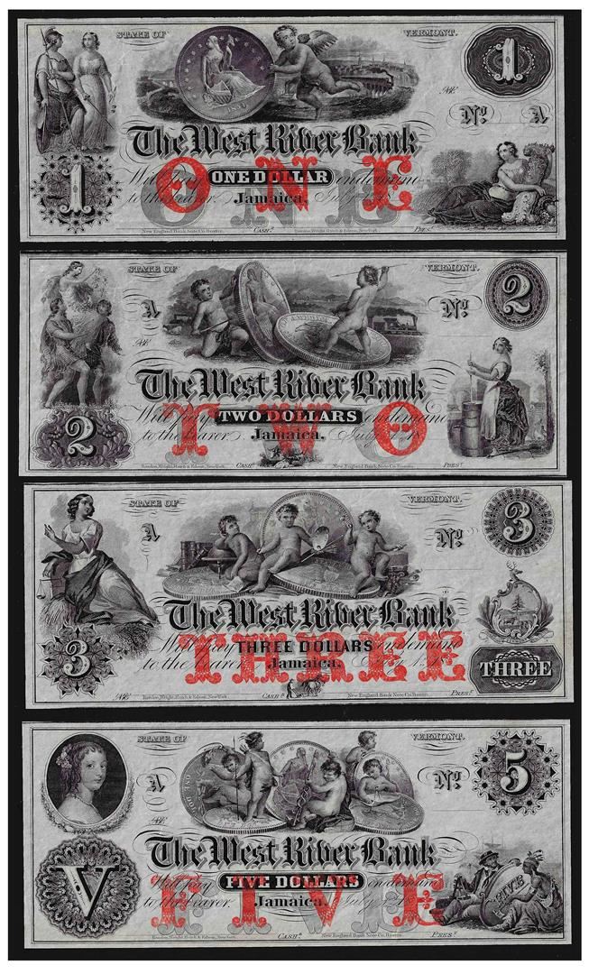 One Cut Sheet of (4) 1800s The West River Bank Obsolete Notes.
