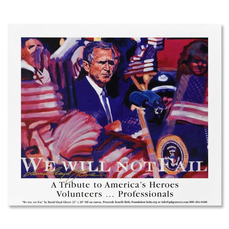 "We Will Not Fail" is a hand signed poster by David Glover. Measures approx. 24" x 20". There is minor wear on the corners and edges.