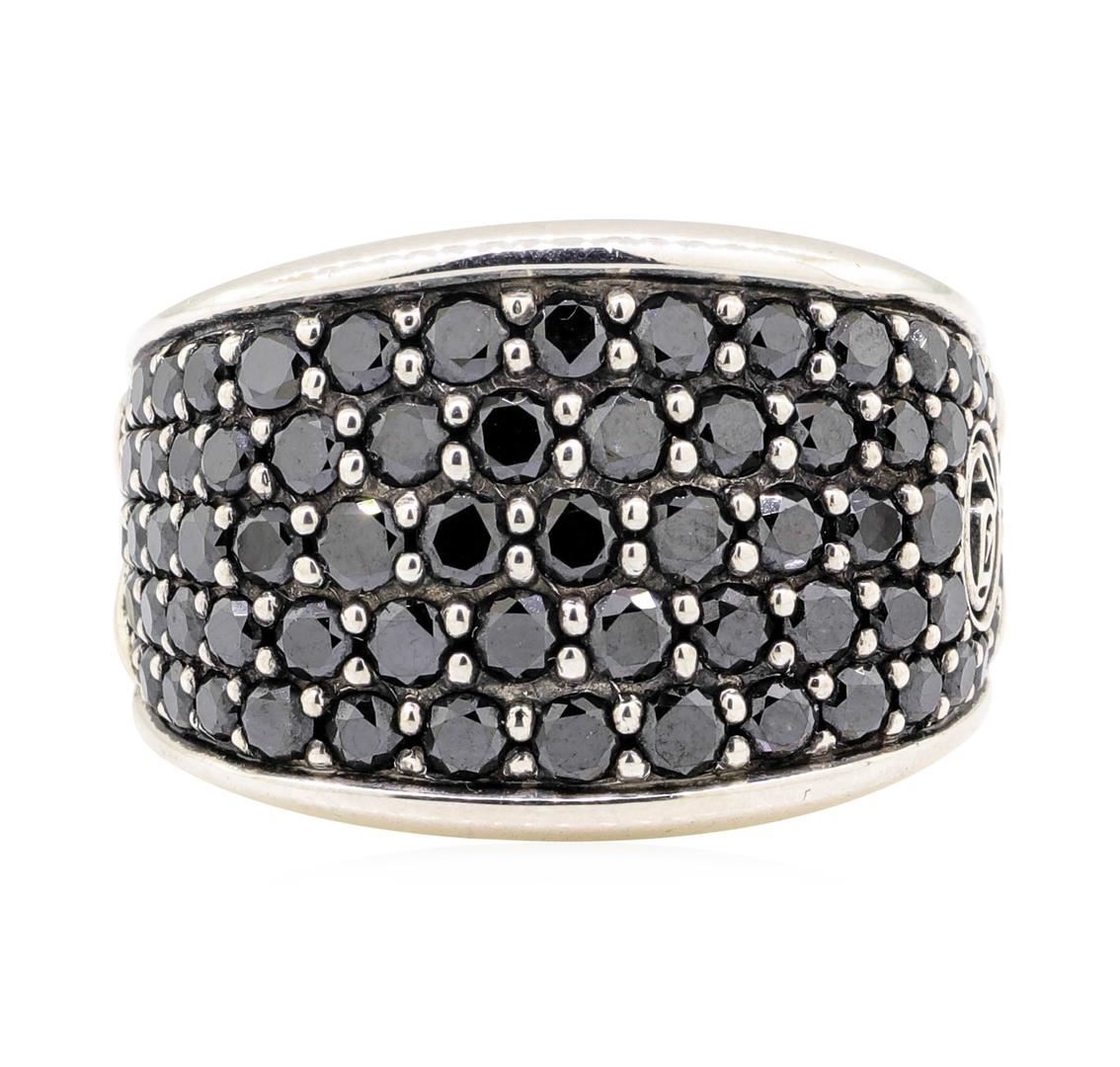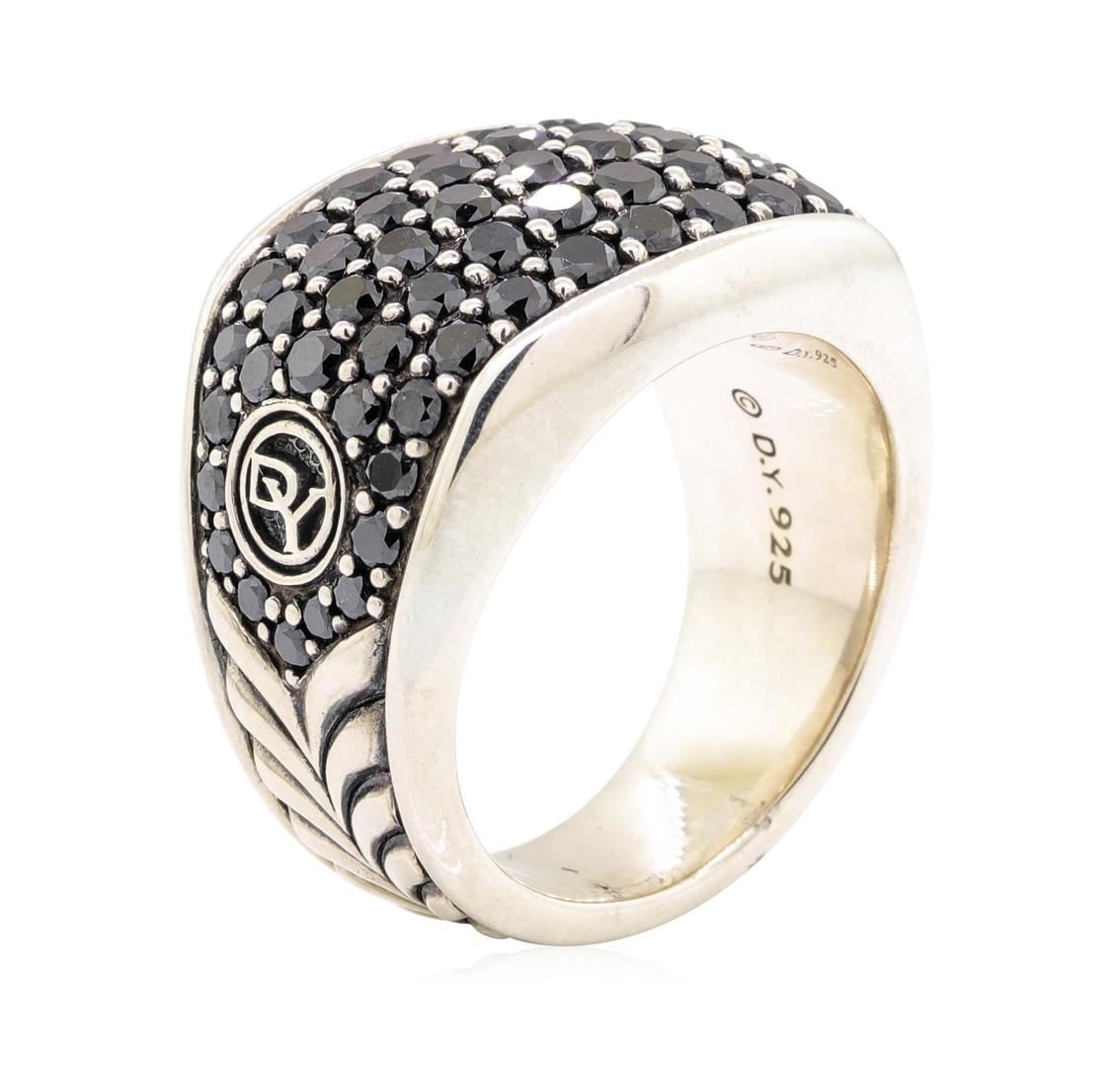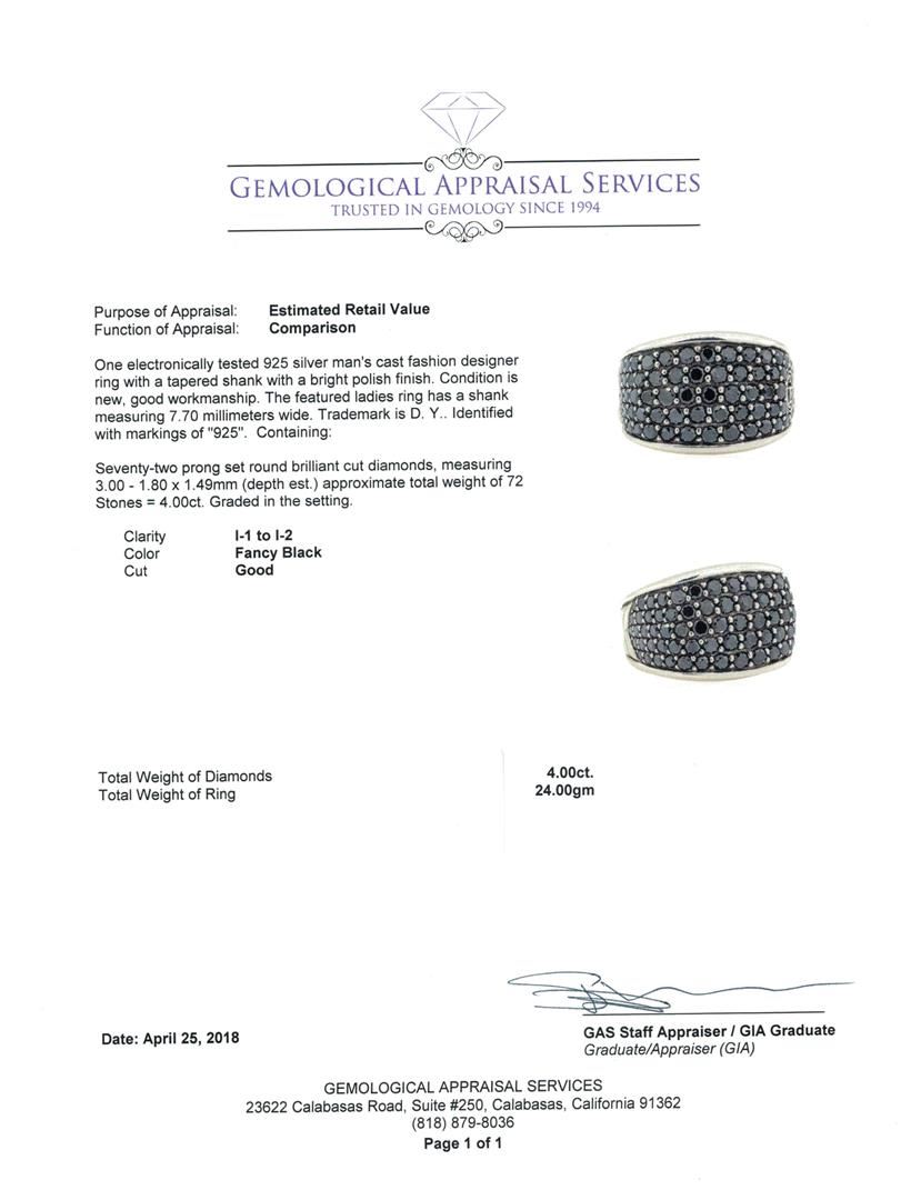 One electronically tested 925 silver Men's cast fashion designer ring with a tapered shank with a bright polish finish. The featured ladies ring has a shank measuring 7.70 millimeters wide. Trademark is D. Y. Identified with markings of '925'. Condition is new, good workmanship. Containing: Seventy-Two prong set round brilliant cut diamonds, measuring 3.00 - 1.80 x 1.49mm (depth est.) approximate total weight of 72 Stones = 4.00ct. Graded in the setting. Color Fancy Black Clarity I-1 to I-2 Cut Good. Total Weight of Diamonds 4.00ct.. Total Weight of Ring 24.00gm. GAS Appraised.