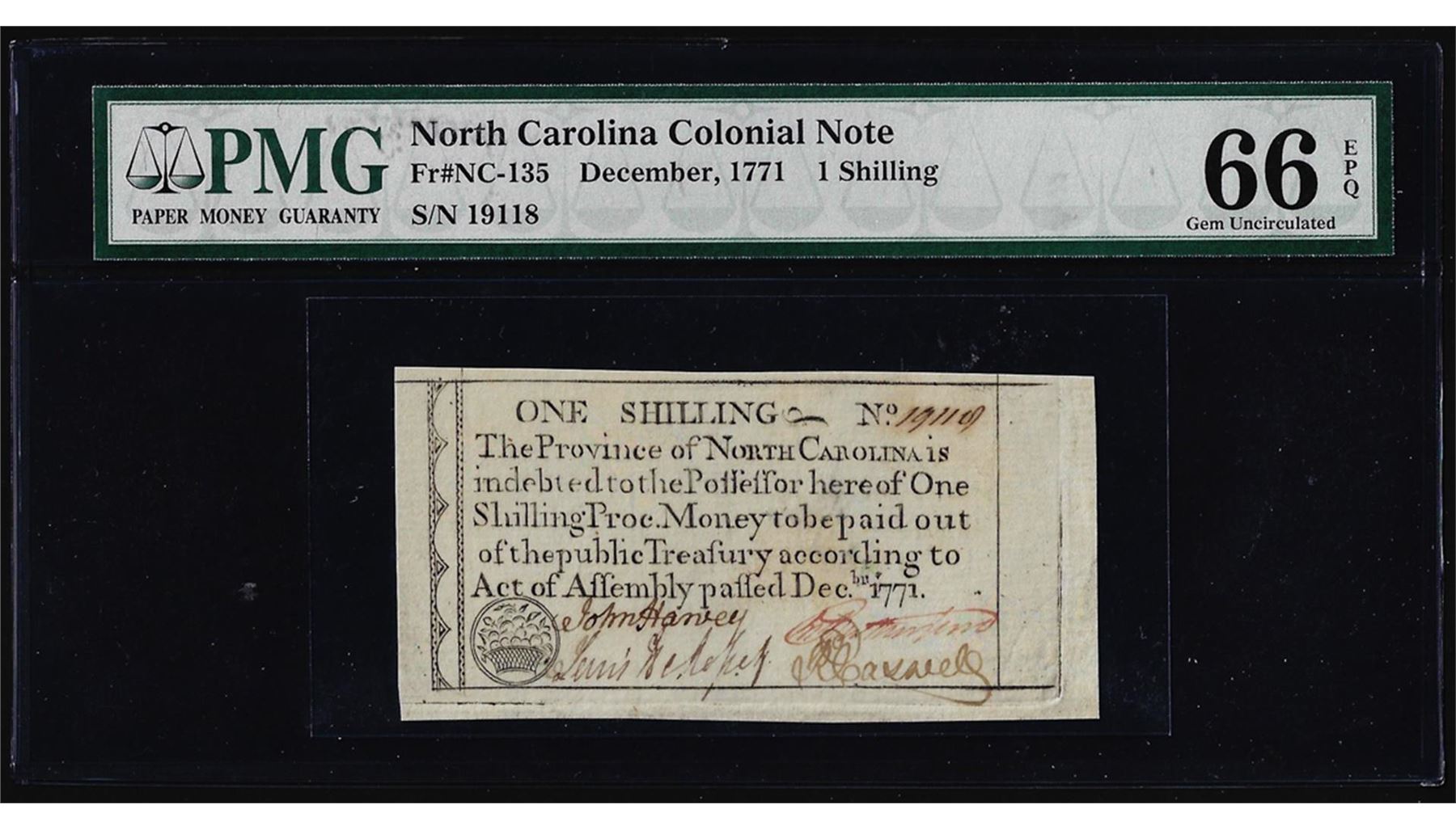 December, 1771 North Carolina 1 Shilling Colonial Currency Note PMG Gem Unc. 66EPQ