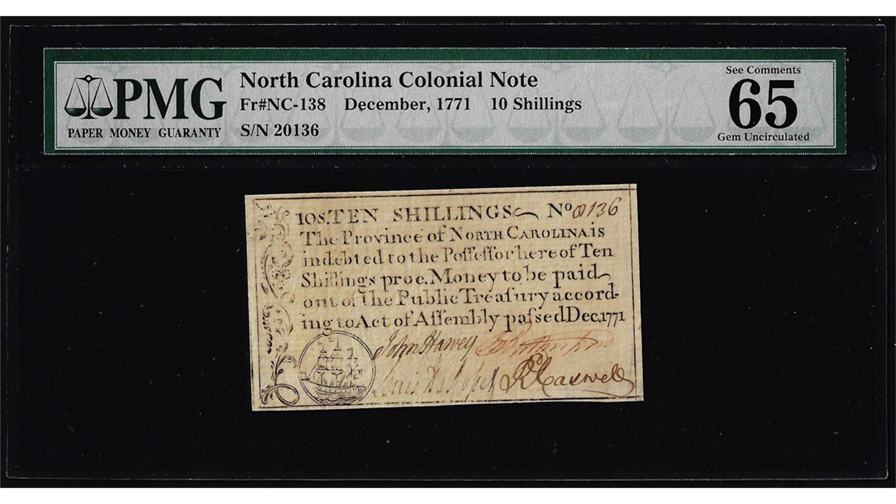 December, 1771 North Carolina 10 Shillings Colonial Currency Note PMG Gem Unc. 65EPQ