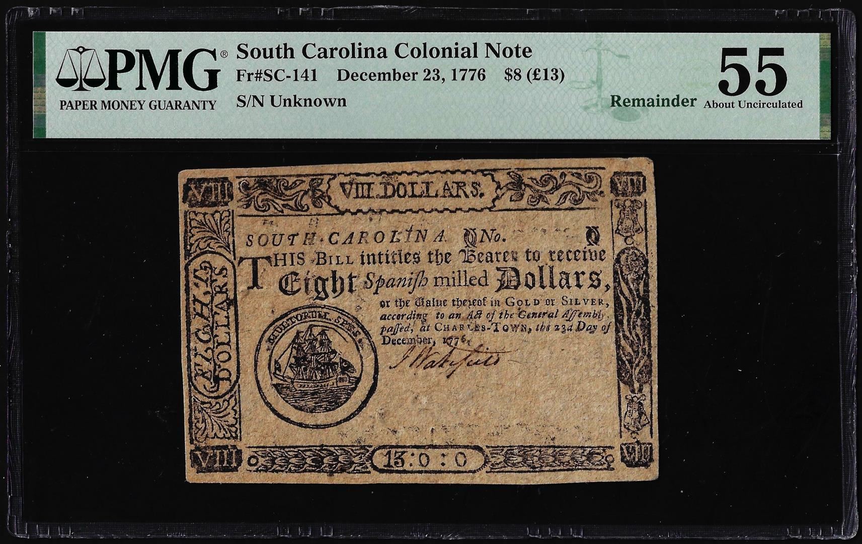 One December 23 1776 $8 South Carolina Colonial Note Fr. SC-141 PMG About Uncirculated 55. PMG Certified.